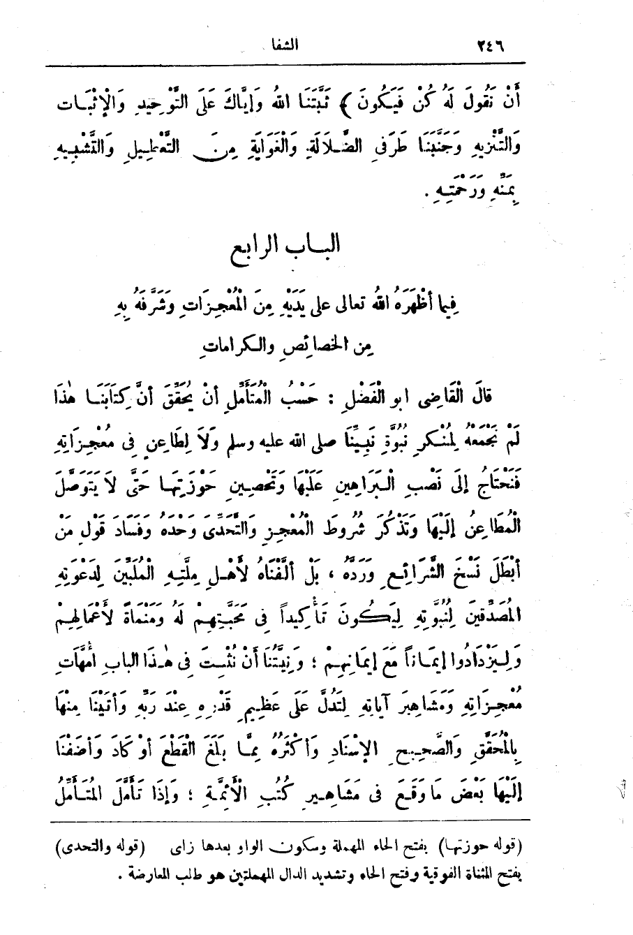 قَالَ الْقَاضِي أَبُو الْفَضْلِ: حَسْبُ الْمُتَأَمّلِ أَنَّ يُحَقّقَ أَنَّ كِتَابَنَا هَذَا لَمْ نَجَْمعهُ لِمُنْكِرِ نُبُوَّةِ نَبِيّنَا صَلَّى اللَّهُ عَلَيْهِ وَسَلَّمَ وَلَا لِطَاعِنٍ فِي مُعْجزَاتِهِ فَنَحْتَاجُ إِلَى نَصْبِ الْبَرَاهِينِ عَلَيْهَا وَتَحْصِينِ حَوْزَتِهَا حَتَّى لَا يَتَوَصَّلَ الْمُطَاعِنُ إِلَيْهَا وتذكر شُرُوطَ الْمُعْجِزِ وَالتَّحَدّي وَحْدَهُ وَفسَادَ قَوْلِ من أَبْطَلَ نَسْخَ الشَّرَائِعِ وَرَدَّهُ، بَلْ أَلَّفْنَاهُ لِأَهْلِ مِلَّتِهِ الْمُلبّينَ لِدَعْوَتِهِ الْمُصَدّقِينَ لنُبُوَّتِهِ لِيَكُونَ تَأكِيدًا فِي مَحَبَّتِهِمْ لَهُ ومنماة لأعمالهم وليزدادوا إِيمَانًا مَعَ إِيمَانِهِمْ، وَنِيَّتُنَا أنْ نُثْبِتَ في هذا الباب أمهات معجزاته ومشاهير آياته لتدل على عظيم قدره عند ربه وأتينا مِنْهَا بِالْمُحَقَّقِ وَالصَّحِيحِ الْإِسْنَادِ وَأَكْثَرُهُ مِمَّا بَلَغَ الْقَطْعَ أَوْ كَادَ وَأَضَفْنَا إِلَيْهَا بَعْضُ مَا وَقَعَ فِي مَشَاهِيرِ كُتُبِ الأئِمّةِ، وَإذَا تَأمَّلَ الْمُتَأَمّلُ