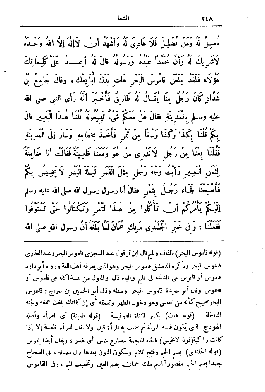 مُضِلَّ لَهُ وَمِنْ يُضْلِلْ فَلا هَادِيَ لَهُ وَأَشْهَدُ أَنْ لا إِلهَ إِلا اللَّهُ وَحْدَهُ لَا شَرِيكَ لَهُ وَأَنَّ مُحَمَّدًا عَبْدُهُ وَرَسُولُهُ قَالَ لَهُ أَعِدْ عَلَيَّ كَلِمَاتِكَ هَؤْلَاءِ فَلَقَدْ بلغان قاموسي الْبَحْرِ هَاتِ يَدَكَ أُبَايِعْكَ) وَقَالَ جَامِعُ بْنُ شَدَّادٍ كَانَ رَجُلٌ مِنَّا يُقَالُ لَهُ طَارِقٌ فَأخْبَرَ أنَّهُ رَأَى النَّبِيَّ صَلَّى اللَّهُ عَلَيْهِ وَسَلَّمَ بِالْمَدِينَةِ فَقَالَ هل معكم شئ تييعونه قُلْنَا هَذَا الْبَعِيرُ قَالَ بِكَمْ قُلْنَا بِكَذَا وَكَذَا وَسْقًَا مِنْ تَمْرٍ فَأخَذَ بِخِطَامِهِ وَسَارَ إِلَى الْمَدِينَةِ فَقُلْنَا بِعْنَا مِنْ رَجُلٍ لَا نَدْرِي مَنْ هُوَ وَمَعَنَا ظَعِينَةٌ فَقَالَتْ أَنَا ضَامِنَةٌ