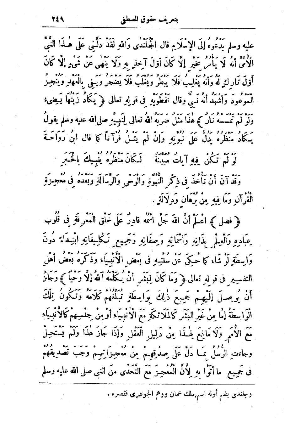 (فصل) اعْلَمْ أَنَّ اللَّه جَلَّ اسْمُهُ قَادِرٌ عَلَى خَلْقِ الْمَعْرِفَةِ فِي قُلُوبِ عِبَادِهِ وَالْعِلْمِ بِذَاتِهِ وَأسْمَائِهِ وَصِفَاتِهِ وجيمع تَكْلِيفَاتِهِ ابْتَدَاءً دُونَ وَاسِطَةٍ لَوْ شَاءَ كَمَا حُكِيَ عَنْ سُنَّتِهِ فِي بَعْضُ الأنبياء وذكر بَعْضُ أَهْلُ التَّفْسِيرِ فِي قَوْلِهِ تَعَالَى (وَمَا كَانَ لِبَشَرٍ أَنْ يُكَلِّمَهُ اللَّهُ إِلا وَحْيًا) وَجَائِزٌ أنْ يُوصِلَ إِلَيْهِمْ جَمِيعَ ذَلِكَ بِوَاسِطَةٍ تُبَلّغُهُمْ كَلَامَهُ وَتَكُونُ تِلْكَ الْوَاسِطَةُ إِمَّا من غرى الْبَشَرِ كَالْمَلَائِكَةِ مَعَ الْأَنْبِيَاءِ أَوْ من جِنْسِهِمْ كَالْأَنْبِيَاءِ مَعَ الْأُمَمِ وَلَا مَانِع لِهَذَا من دَلِيلِ الْعَقْلِ وَإذَا جَازَ هَذَا وَلَمْ يَسْتَحِلْ وَجَاءَتِ الرُّسُلُ بِمَا دَلَّ عَلَى صِدْقِهِمْ من مُعْجِزَاتِهِمْ وَجَبَ نصديقهم فِي جَمِيعِ مَا أَتَوْا بِهِ لِأَنَّ الْمُعْجِزَ مَعَ التَّحَدّي مِنَ النَّبِيّ صَلَّى اللَّهُ عَلَيْهِ وسلم