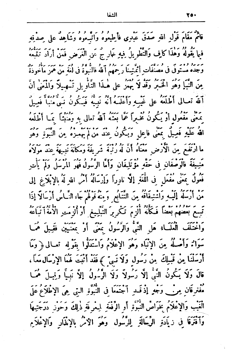 قَائِمٌ مَقَام قَوْلِ اللَّه صَدَقَ عَبْدي فَأَطِيعُوهُ وَاتّبِعُوهُ وَشَاهِدٌ عَلَى صِدْقِهِ فِيمَا يَقُولُهُ وَهَذَا كَافٍ وَالتَّطْوِيلُ فِيهِ خَارجٌ عَنِ الْغَرضِ فَمَنْ أرَادَ تَتبُّعَهُ وَجَدَهُ مُسْتَوْفَى فِي مُصَنَّفَاتِ أَئِمَّتِنَا رحمهم الله فالنبوة في لعة من همز مأخودة مِنَ النَّبإِ وَهُوَ الْخَبَرُ وَقَدْ لَا يُهْمَزُ عَلَى هَذَا التَّأْوِيلِ تَسْهِيلًا وَالْمَعْنَى أَنَّ اللَّه تعالى أَطْلَعَهُ عَلَى غَيْبِهِ وأسلمه أنَّهُ نَبِيُّهُ فَيَكُونُ نَبِيّ مُنَبَّأ فَعِيلٌ بِمَعْنَي مَفْعُولٍ أَوْ يَكُونُ مُخْبِرًا عَمَّا بَعَثَهُ اللَّه تَعَالَى بِهِ وَمُنَبّئًا بِمَا أَطْلَعَهُ اللَّه عَلَيْهِ فَعِيلٌ بِمَعْنَي فَاعِلٍ ويَكُونُ عِنْدَ من لَمْ يَهْمزْهُ مِنَ النُّبُوَّةِ وَهُوَ مَا ارْتَفَعَ مِنَ الْأَرْضِ مَعْنَاهُ أَنَّ لَهُ رُتْبَةً شَرِيفَةً وَمَكَانَةً نَبِيهَةً عِنْدَ مَوْلَاهُ منيفة قالو صفان فِي حَقَّهِ مُؤْتَلِفَانِ وَأَمَّا الرَّسُولُ فَهُوَ الْمُرْسَلُ وَلَمْ يَأْتِ