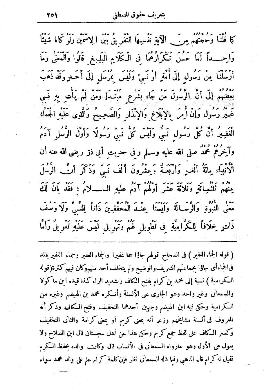 (قوله الجماء الغفير) في الصحاح قولهم جاؤا جما غفيرا والجماء الغفير وجماء الغفير بالمد في الجماء أي جاؤا بجماعتهم الشريف والوضيع ولم يتخلف أحد منهم وكان فيهم كثرة (قوله الكرامية) نسبه إلى محمد بن كرام بفتح الكاف وتشديد الراء كذا قيده ابن ماكولا والسمعاني وغير واحد وهو الجارى على الألسنة وأنكره محمد بن الهيضم وغيره من الكرامية وحكى فيه ابن الهيضم وجهين أحدهما التخفيف وفتح الكاف وذكر أنه المعروف في ألسنة مشايخهم وزعم أنه بمعنى كريم أو بمعنى كرامة والثانى التخفيف وكسر الكاف على لفظ جمع كريم وحكى هذا عن أهل سجستان قال ابن الصلاح ولا يعول على الأول وهو ما رواه السمعاني في الأنساب قال وكان والده يحفظ الكرم فقيل له كرام قال الذهبي وفيما قاله السمعاني نظر فإن كلمة كرام علم على والد محد سواء (*)