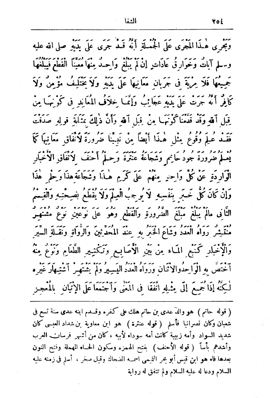 وَيَجَرِي هَذَا الْمَجْرَى عَلَى الْجُمْلَةِ أنَّهُ قَدْ جَرَى عَلَى يَدَيْهِ صَلَّى اللَّهُ عَلَيْهِ وَسَلَّمَ آيَاتٌ وَخَوارِقُ عَادَاتٍ إنْ لم يبلغا وَاحِدٌ مِنْهَا مُعَيَّنًا الْقَطْعَ فَيَبْلُغُهَا جَمِيعُهَا فَلَا مِرْيَةَ فِي جَرَيانِ مَعَانِيهَا عَلَى يَدْيهِ وَلَا يَخْتَلِفُ مُؤْمِنٌ وَلَا كَافِرٌ أنَّهُ جَرَتْ عَلَى يَدَيْهِ عَجَائِبُ وَإِنَّمَا خِلَافُ الْمُعَانِدِ فِي كَوْنِهَا من قِبَلِ اللَّه وَقَدْ قَدَّمْنَا كَوْنَهَا من قِبَلِ اللَّه وَأَنَّ ذَلِكَ بِمَثَابَةِ قَوْلِهِ صَدَقْتَ فَقَدْ عُلِمَ وَقُوعُ مِثْلِ هَذَا أيْضًا من نَبِيّنَا ضَرُورَةً لا نفاق مَعَانِيهَا كَمَا يُعْلَمُ ضَرُورَةً جُودُ حَاتِمٍ وَشَجَاعَةُ عَنْتَرَةَ وَحِلْمُ أحنف لاتِّفَاقِ الْأَخْبَارِ الْوَارِدَةِ عَنْ كُلِّ وَاحِدٍ مِنْهُمْ عَلَى كَرَمِ هَذَا وَشَجَاعَةِ هَذَا وَحِلْمِ هَذَا وَإِنْ كَانَ كُلُّ خَبَرٍ بِنَفْسِهِ لَا يُوجِبُ الْعِلْمَ وَلَا يُقْطَعُ بَصِحَّتِهِ وَالْقِسْمُ الثاني مَا لَمْ يَبْلُغْ مَبْلَغَ الضَّرُورَةِ وَالْقَطْعِ وَهُوَ عَلَى نَوْعَيْنِ نَوْعٌ مُشْتَهِرٌ مُنْتَشِرٌ رَوَاهُ الْعَدَدُ وَشَاعَ الْخبَرُ بِهِ عِنْدَ الْمُحَدّثِينَ وَالرُّوَاةِ وَنَقَلَةِ السِّيَرِ وَالْأَخْبَارِ كَنَبْعِ الْمَاءِ من بَيْنَ الْأَصَابعِ وَتَكِثيرِ الطَّعَامِ وَنَوْعٌ مِنْهُ اخْتَصَّ بِهِ الْوَاحِدُ وَالاثْنَانِ وَرَوَاهُ الْعَدَدُ الْيَسِيرُ وَلَمْ يَْشتَهِرِ اشْتِهَارَ غَيْرِهِ لَكِنَّهُ إذَا جُمِعَ إِلَى مِثْلِهِ اتْفَقَا فِي الْمَعْنَى وَاجْتَمَعَا عَلَى الْإِتْيَانِ بالمعجز