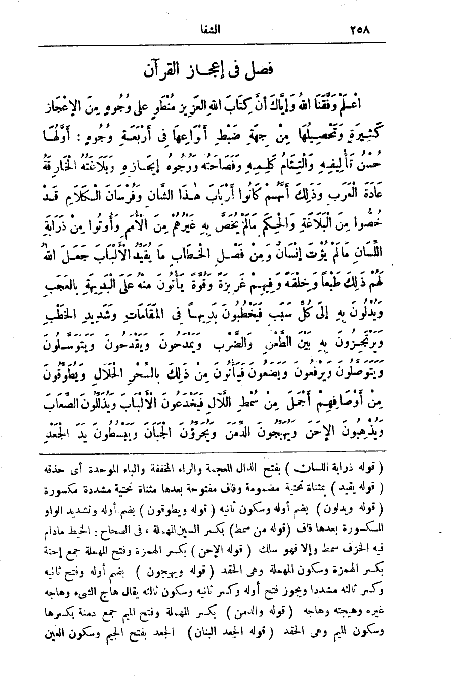 حُسْنُ تَأْلِيفِهِ وَالتِئَامُ كَلِمِهِ وَفَصَاحَتُهُ وَوُجُوهُ إِيجَازِهِ وَبَلاغَتُهُ لخارقة عَادَةُ الْعَرَبِ وَذَلِكَ أَنَّهُمْ كَانُوا أَرْبَابَ هَذَا الشَّأْنِ وَفُرْسَانَ الْكَلَامِ قَدْ خُصُّوا مِنَ الْبَلَاغَةِ وَالْحِكَمِ مَا لَمْ يُخَصَّ بِهِ غَيْرُهُمْ مِنَ الْأُمَمِ وَأُوتُوا من ذَرَابَةِ اللّسَانِ مَا لَمْ يُؤْتَ إِنْسانٌ وَمِنْ فَصْلِ الْخِطَابِ مَا يُقَيّد الْألبَابَ جَعَلَ اللَّه لَهُمْ ذَلِكَ طَبْعًا وَخِلْقَةً وفِيهِمْ غَرِيزَةً وَقُوَّةً يَأْتُونَ مِنْهُ عَلَى الْبَدِيهَةِ بِالعَجَبِ وَيُدْلُونَ بِهِ إِلَى كُلِّ سَبَبٍ فَيَخْطُبُونَ بَدِيهًا فِي الْمَقَامَاتِ وَشَدِيدِ الْخَطْبِ وَيَرْتَجِزُونَ بِهِ بَيْنَ الطَّعْنِ وَالضَّرْبِ وَيَمْدَحُونَ وَيَقْدَحُونَ وَيَتَوَسَّلُونَ وَيَتَوَصَّلُونَ وَيَرْفَعُونَ وَيَضَعُونَ فَيَأتُونَ من ذَلِكَ بِالسّحْرِ الْحَلَالِ وَيُطَوّقُونَ من أَوْصَافِهِمْ أَجْمَلَ من سِمْطِ اللّآل فَيَخْدَعُونَ الْألْبَابَ وَيُذَلّلُونَ الصّعَابَ وَيُذْهِبُونَ الْإِحَنَ ويهجون الدمن ويجرؤن الْجَبَانَ وَيَبْسُطُونَ يَدَ الجعد