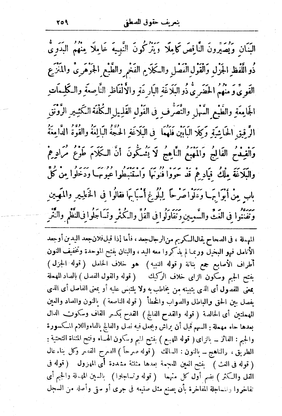 البنان ويصيورن النَّاقِصَ كَامِلًا وَيَتْرُكُونَ النَّبيهَ خَامِلًا مِنْهُمُ الْبَدَويُّ ذُو اللَّفْظِ الجزل والقول المصل وَالْكَلَامِ الْفَخْمِ وَالطَّبْعِ الجَوْهِرِيّ وَالمَنْزَعِ القَوِيّ وَمِنْهُمُ الحصرى ذُو الْبَلَاغَةِ الْبَارِعَةِ والألفاظ الناطعة وَالْكَلِمَاتِ الْجَامِعَةِ وَالطّبْعِ السَّهْلِ وَالتَّصَرُّفِ فِي الْقَوْلِ الْقَلِيلِ الْكُلْفَةِ الْكَثِيرِ الرَّوْنَقِ الرَّقِيقِ الْحَاشِيَةِ وَكِلَا الْبَابَيْنِ فَلَهُمَا فِي الْبَلَاغَةِ الْحُجَّةُ الْبَالِغَةُ وَالْقُوَّةُ الدَّامِغَةُ وَالْقِدْحُ الْفَالِجُ وَالْمَهْيَعُ النَّاهِجُ لَا يَشُكُّونَ أَنَّ الْكَلَامَ طَوْعُ مُرَادِهِمْ وَالْبَلَاغَةَ ملك فيادهم قَدْ حَوَوْا فُنُونَهَا واستنبطوا عيوبها وَدَخَلُوا من كُلِّ بَابٍ من أَبْوَابِهَا وَعَلَوْا صَرْحًا لِبُلُوغِ أَسْبَابِهَا فَقَالُوا فِي الْخَطِيرِ وَالْمَهِينِ وَتَفَنَّنُوا فِي الْغَثِّ وَالسَّمِينِ وَتَقَاوَلُوا فِي الْقُلّ وَالْكُثْرِ وَتَسَاجَلُوا فِي النظم والنثر