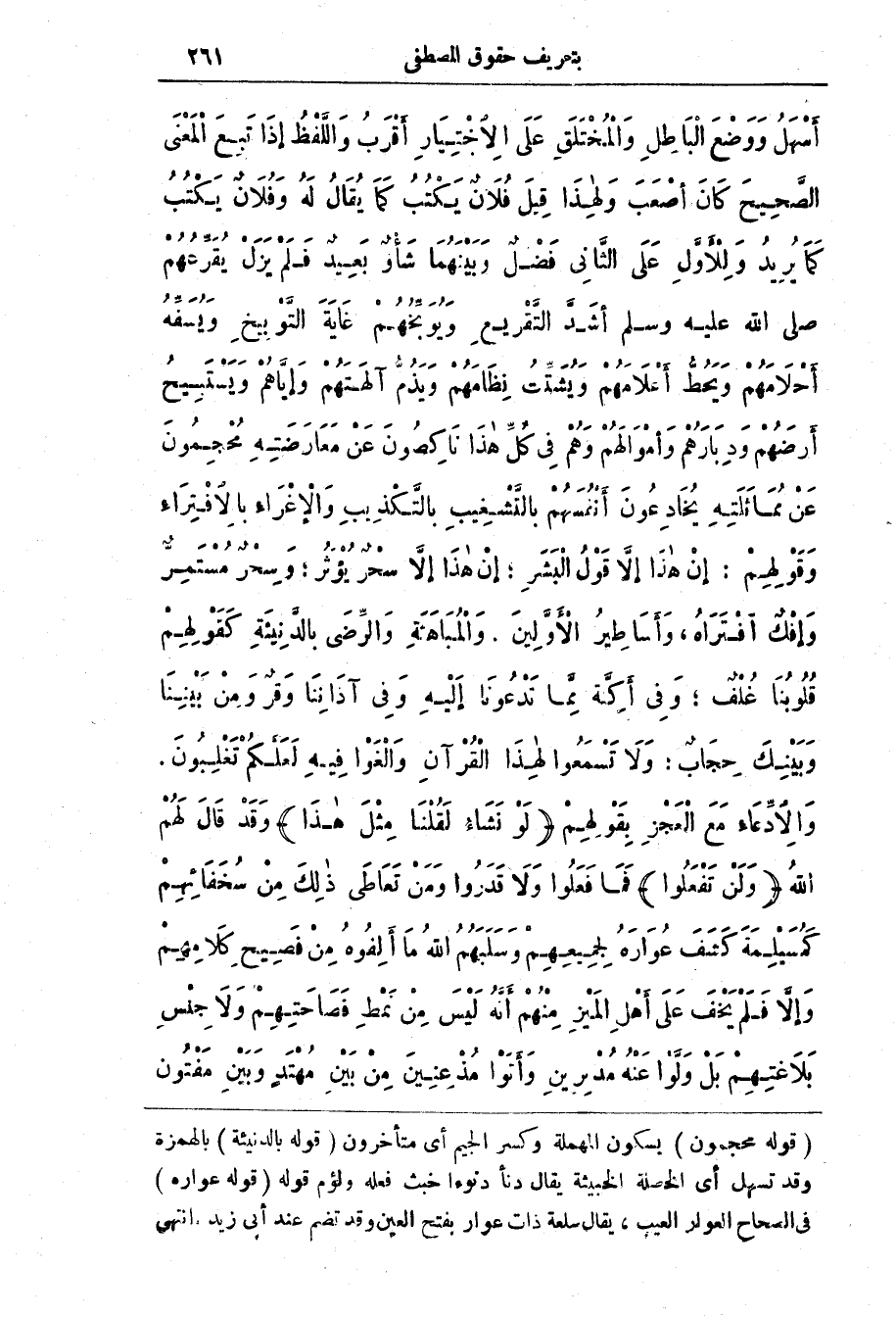 كَمَا يُرِيدُ وَلِلأوَّلِ عَلَى الثَّانِي فَضْلٌ وَبَيْنَهُمَا شَأْوٌ بَعِيدٌ فَلَمْ يَزَلْ يُقرّعُهُم صَلَّى اللَّهُ عَلَيْهِ وَسَلَّمَ أَشَدَّ التَّقْرِيعِ وَيُوَبّخُهُمْ غَايَةَ التَّوْبِيخِ وَيُسَفِّهُ أَحْلَامَهُمْ وَيَحُطُّ أَعْلَامَهُمْ وَيُشَتّتُ نِظَامَهُمْ وَيَذُمُّ آلِهَتَهُمْ وَإيَّاهُمْ وَيَسْتَبِيحُ أَرْضَهُمْ وَدِيَارَهُمْ وَأَمْوَالَهُمْ وَهُمْ فِي كُلِّ هَذَا نَاكِصُونَ عَنْ مُعَارَضَتِهِ مُحْجِمُونَ عَنْ مُمَاثَلَتِهِ يُخَادِعُونَ أنْفُسَهُمْ بِالتَّشْغِيبِ بِالتَّكْذِيبِ وَالْإِغْرَاءِ بِالافْتِراءِ وَقَوْلِهِمْ: إنْ هَذَا إلَّا قَوْل الْبَشَرِ، إنْ هَذَا إلَّا سِحْرٌ يُؤَثَرُ، وَسِحْرٌ مُسْتَمِرّ وَإِفْكٌ افْتَرَاهُ، وَأَسَاطِيرُ الْأَوَّلِينَ.