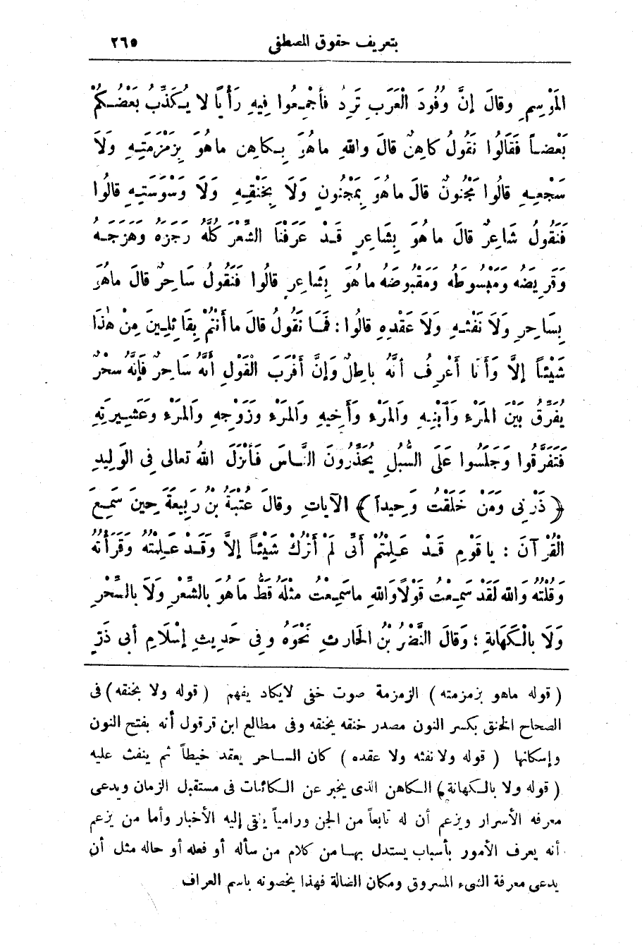 شَيْئًا إلَّا وَأَنَا أَعْرِفُ أنَّهُ بَاطِلٌ وَإِنَّ أَقْرَبَ الْقَوْلِ أنَّهُ سَاحِرٌ فَإنَّهُ سِحْرٌ يُفَرّق بَيْنَ الْمَرْءِ وابْنِهِ والمرء وأخيه وَالْمرْءِ وزَوْجِهِ وَالْمَرْءِ وعشيرته فتفرقوا وَجَلَسُوا عَلَى السُّبُل يُحَذّرُونَ النَّاسَ فَأَنْزَلَ اللَّه تَعَالَى فِي الْوَلِيدِ (ذَرْنِي وَمَنْ خَلَقْتُ وَحِيدًا) الآيَاتِ وَقَالَ عُتَبَةُ بن رَبِيعَةَ حِينَ سَمِعَ الْقُرْآنَ: يَا قَوْم قَدْ عَلِمْتُمْ أني لَمْ أَتْرُكْ شَيْئًا إلَّا وَقَدْ عَلِمْتُهُ وقرأته وَقُلْتُهُ والله لَقَدْ سَمْعتُ قَوْلًا والله مَا سَمِعْتُ مِثلَهُ قَطُّ مَا هُوَ بِالشِّعْرِ وَلَا بِالسّحْرِ وَلَا بِالْكَهَانَةِ، وَقَالَ النَضْرُ بن الْحَارِثِ نَحْوَهُ وَفِي حَديثِ إسْلَامِ أبى ذر