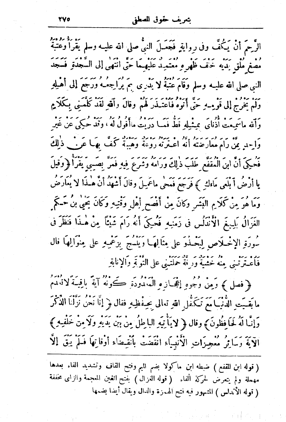 الرَّحِمَ أنْ يَكُفَّ وَفِي رِوَايَةٍ فَجَعَلَ النَّبِيّ صَلَّى اللَّهُ عَلَيْهِ وَسَلَّمَ يَقْرَأُ وَعُتْبَةُ مُصْغٍ مُلْقٍ يَدَيْهِ خَلْفَ ظَهْرِهِ مُعْتَمِدٌ عَلَيْهَمَا حَتَّى انْتَهَى إِلَى السَّجْدَةِ فَسَجَد النَّبِيّ صَلَّى اللَّهُ عَلَيْهِ وَسَلَّمَ وَقَامَ عُتْبَةُ لَا يَدْرِي بم يُرَاجِعُهُ وَرَجَعَ إِلَى أَهْلِهِ وَلَمْ يَخْرُجْ إِلَى قَوْمِهِ حَتَّى أَتَوْهُ فَاعْتَذَرَ لَهُمْ وَقَالَ والله لقد كلمتي بِكَلَامٍ والله مَا سَمِعْتُ أذنايَ بِمِثْلِهِ قَطُّ فَمَا دَرَيْتُ مَا أَقُولُ لَهُ، وَقَدْ حُكِيَ عَنْ غَيْرِ وَاحِدٍ مِمَّنْ رَامَ مُعَارَضتَهُ أنَّهُ اعْتَرتْهُ رَوْعَةٌ وَهَيْبَةٌ كَفَّ بِهَا عَنْ ذَلِكَ فَحُكِيَ أَنَّ ابن المُقَفَّعِ طَلَبَ ذَلِكَ وَرَامَهُ وَشَرَعَ فِيهِ فَمَرَّ بِصَبِيٍّ يَقْرَأُ (وَقِيلَ يَا أَرْضُ ابْلَعِي مَاءَكِ) فرجع فمحى مَا عَمِلَ وَقَالَ أَشْهَدُ أَنَّ هَذَا لَا يُعَارَضُ وَمَا هُوَ من كَلَامِ الْبَشَرِ وَكَانَ من أَفصْحِ أَهْلِ وَقْتِهِ وَكَانَ يَحْيَى بن حَكَم الْغَزَالُ بَلِيغَ الْأَنْدَلُسِ فِي زَمَنِهِ فَحُكِيَ أنَّهُ رَامَ شَيْئًا من هَذَا فَنَظَرَ فِي سُورَةِ الْإِخْلَاصِ ليَحْذُوَ عَلَى مِثَالِهَا وَيَنْسُجَ بِزَعْمِهِ عَلَى مِنْوَالِهَا قَالَ فَاعْتَرَتْنِي مِنْهُ خَشْيَةٌ ورفة حَمَلَتْنِي عَلَى التَّوْبَةِ وَالْإِنَابَة.