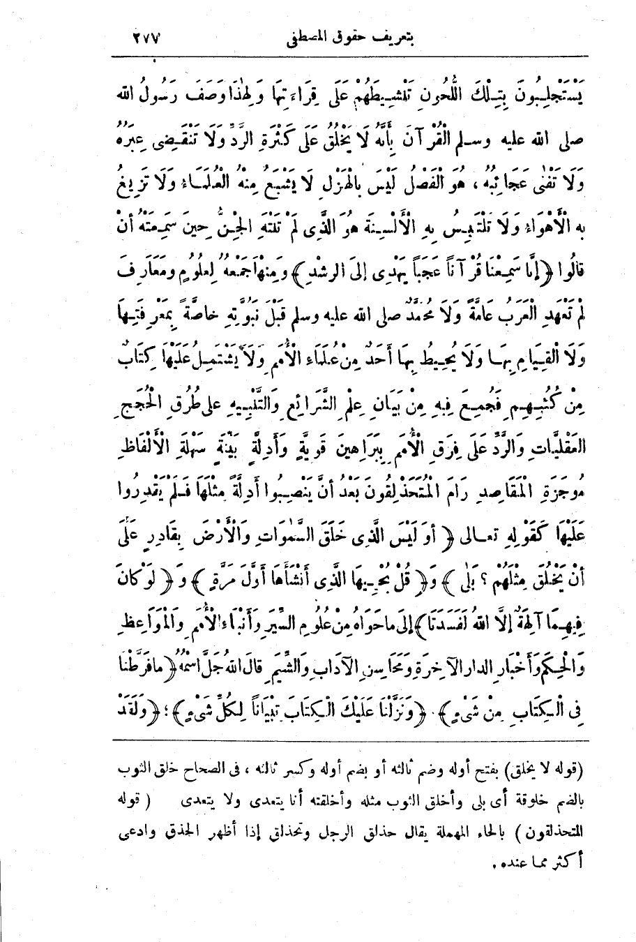 يَسْتَجْلِبُونَ بِتِلْكَ اللُّحُونِ تَنْشِيطَهُمْ عَلَى قِرَاءَتِهَا وِلِهَذَا وَصَفَ رَسُولُ اللَّه صَلَّى اللَّهُ عَلَيْهِ وَسَلَّمَ الْقُرْآنَ بِأنَّهُ لَا يَخْلَقُ عَلَى كَثْرَةِ الرَّدّ وَلَا تَنْقَضِي عِبَرُهُ وَلَا تَفْنَى عَجَائِبُهُ، هُوَ الْفَصْلُ لَيْسَ بِالْهَزْلِ لَا يَشْبَعُ مِنْهُ الْعُلمَاءُ وَلَا تَزِيغُ بِهِ الْأَهْوَاءُ وَلَا تَلْتَبِسُ بِهِ الْأَلْسِنَةُ هُوَ الَّذِي لَمْ تَنْتَهِ الْجِنُّ حين سَمِعَتْهُ أَنْ قَالُوا (إِنَّا سَمِعْنَا قرآنا عجبا يهدى إلى الرشد) وَمِنْهَا جَمْعُهُ لِعُلُومِ وَمَعَارِفَ لَمْ تَعْهَدِ الْعَرَبُ عَامّةً وَلَا مُحَمَّدٌ صَلَّى اللَّهُ عَلَيْهِ وَسَلَّمَ قَبْلَ نُبُوَّتِهِ خَاصَّةً بِمَعْرِفَتِهَا وَلَا الْقِيَامِ بِهَا وَلَا يُحِيطُ بِهَا أَحَدٌ من عُلمَاءِ الْأُمَم وَلَا يَشْتَمِلُ عَلَيْهَا كِتَابٌ من كُتُبِهِمْ فَجُمِعَ فِيهِ من بَيَانِ عِلْمِ الشَّرَائِعِ وَالتَّنْبِيهِ عَلَى طُرُق الْحُجَجِ الْعَقْليَّاتِ وَالرَّدّ عَلَى فِرقِ الْأُمَم بِبَرَاهِينَ قَويّةٍ وَأَدِلَّةٍ بَيّنَةٍ سَهْلَةِ الْأَلْفَاظِ مُوجَزَة الْمَقَاصِدِ رَامَ الْمُتَحَذْلِقُونَ بَعْدَ أَنْ يَنْصِبُوا أَدِلَّةً مِثْلَهَا فَلَمْ يَقْدِرُوا عَلَيْهَا كَقَوْلِهِ تَعَالَى (أَو لَيْس الَّذِي خَلَقَ السَّمَوَاتِ وَالأَرْضَ بِقَادِرٍ عَلَى أَنْ يَخْلُقَ مِثْلَهُمْ؟ بَلَى) و (قُلْ يُحْيِيهَا الَّذِي أَنْشَأَهَا أَوَّلَ مَرَّةٍ) و (لَوْ كَانَ فِيهِمَا آلِهَةٌ إِلا اللَّهُ لَفَسَدَتَا) إِلَى مَا حَوَاهُ من عُلُومِ السّيَرِ وَأَنْبَاءِ الْأُمَم وَالْمَوَاعِظِ وَالْحِكَمِ وَأَخْبَار الدَّار الآخِرَةِ وَمَحَاسِنِ الآدَابِ وَالشِّيَمِ قَالَ اللَّه جَلَّ اسْمُهُ (مَا فَرَّطْنَا فِي الْكِتَابِ من شئ) (وَنَزَّلْنَا عَلَيْكَ الْكِتَابَ تبيانا لكل شئ) ، (ولقد