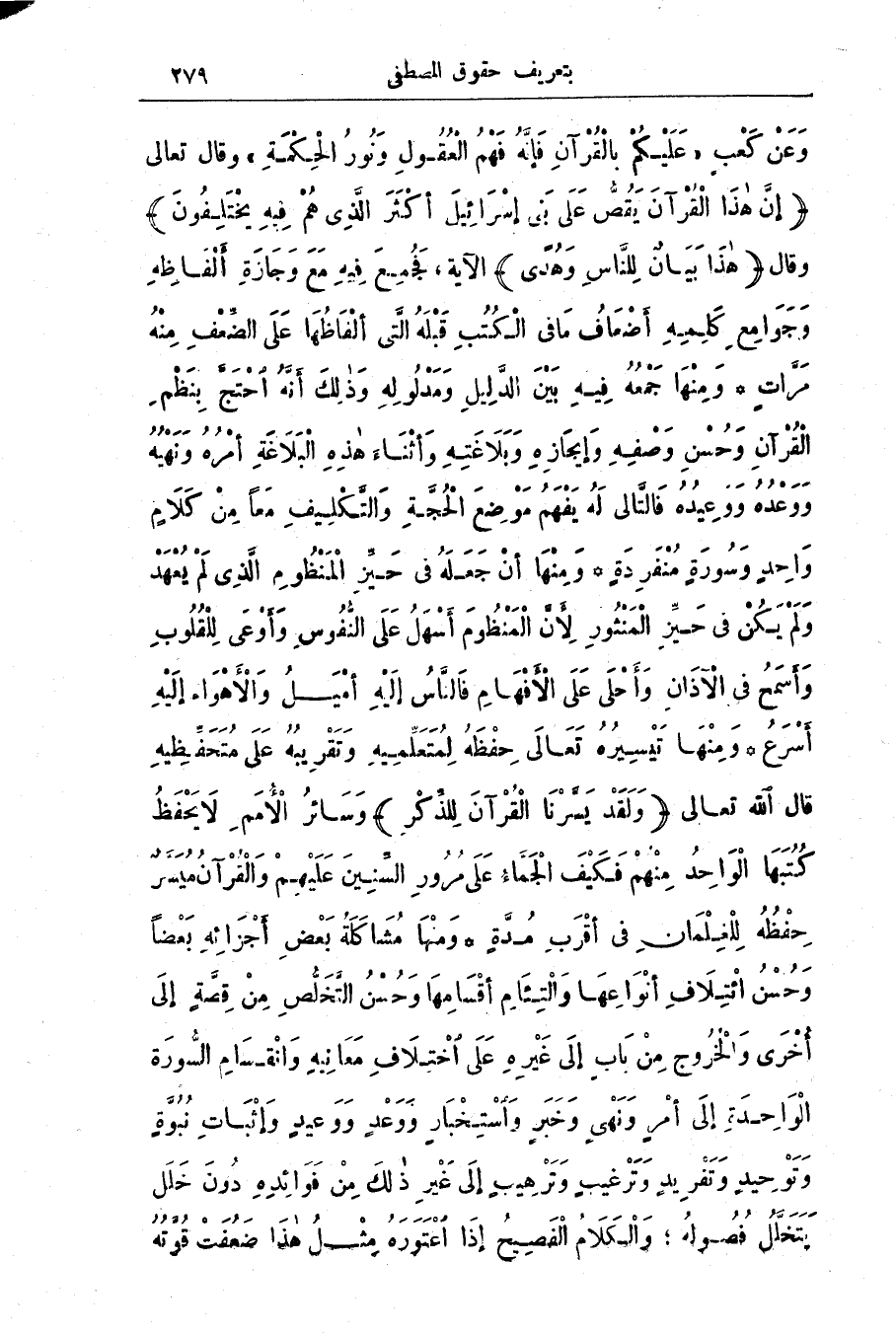 وعن كعب (عليكم بِالْقُرْآنِ فَإِنَّهُ فَهْمُ الْعُقُولِ وَنُورُ الْحِكْمَةِ) وَقَالَ تعالى (إن هذا القرآن يَقُصُّ عَلَى بَنِي إِسْرَائِيلَ أَكْثَرَ الَّذِي هُمْ فِيهِ يَخْتَلِفُونَ) وَقَالَ (هَذَا بَيَانٌ للناس وهدى) الآية، فَجُمِعَ فِيهِ مَعَ وَجَازَةِ أَلْفَاظِهِ