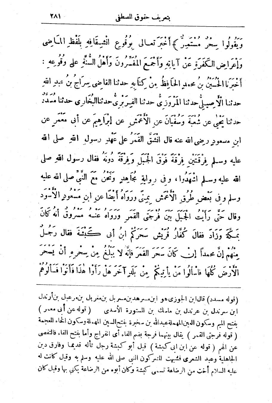 وَيَقُولُوا سِحْرٌ مُسْتَمِرٌّ) أَخْبَرَ تَعَالَى بِوُقُوعِ انْشِقَاقِهِ بِلَفْظِ الْمَاضِي وَإِعْرَاضِ الْكَفَرَةِ عَنْ آيَاتِهِ وَأَجْمَعَ الْمُفَسِّرُونَ وَأَهْلُ السُّنَّةِ عَلَى وُقُوعِهِ: أَخْبَرَنَا الْحُسَيْنُ بْنُ مُحَمَّدٍ الْحَافِظُ مِنْ كِتَابِهِ حَدَّثَنَا الْقَاضِي سِرَاجُ بْنُ عَبُدِ اللَّهِ حَدَّثَنَا الْأَصِيلِيُّ حَدَّثَنَا المَرْوَزِيُّ حَدَّثَنَا الْفَرَبْرِيُّ حَدَّثَنَا الْبُخَارِيُّ حَدَّثَنَا مُسَدَّدٌ حَدَّثَنَا يَحْيَى عَنْ شُعْبَةَ وسُفْيَانَ عَنِ الْأَعْمَشِ عَنْ إِبْرَاهِيمَ عَنْ أَبِي مَعْمَرٍ عَنِ ابْنِ مَسْعُودٍ رَضِيَ اللَّهُ عَنْهُ قَالَ انْشَقَّ الْقَمَرُ عَلَى عَهْدِ رَسُولِ اللَّهِ صَلَّى اللَّهُ عَلَيْهِ وَسَلَّمَ فِرْقَتَيْنِ فِرْقَةٌ فَوْقَ الْجَبَلِ وَفِرْقَةٌ دُونَهُ فَقَالَ رَسُولُ اللَّهِ صَلَّى اللَّهُ عَلَيْهِ وَسَلَّمَ اشْهَدُوا، وَفِي رِوَايَةِ مُجَاهِدٍ وَنَحْنُ مَعَ النَّبِيّ صَلَّى اللَّهُ عَلَيْهِ