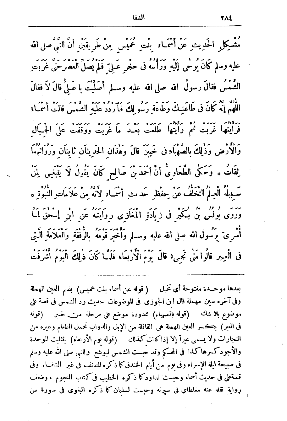 مُشْكِلِ الْحَدِيثِ عَنْ أَسْمَاءَ بِنْتِ عُمَيْسٍ من طَرِيقَيْنِ أَنّ النَّبِيّ صَلَّى اللَّهُ عَلَيْهِ وَسَلَّمَ كَانَ يُوحَى إِلَيْهِ وَرَأْسُهُ فِي حِجْرِ عَلِيٍّ فَلَمْ يُصَلِّ الْعَصْرَ حَتَّى غَرَبَتِ الشَّمْسُ فَقَالَ رَسُولُ اللَّه صَلَّى اللَّهُ عَلَيْهِ وَسَلَّمَ أَصَلَّيْتَ يَا عَلِيُّ قَالَ لَا فَقَالَ اللَّهُمَّ إنَّهُ كَانَ فِي طَاعَتِكَ وَطَاعَةِ رَسُولِكَ فَارْدُدْ عَلَيْهِ الشَّمْسَ قَالَتْ أَسْمَاءُ فَرَأَيْتُهَا غربت ثم رأيتها طَلَعت بَعْدَ مَا غَرَبَتْ وَوَقَفَتْ عَلَى الْجِبَالِ وَالْأَرْضِ وَذَلِكَ بِالصَّهْبَاءِ فِي خيْبَرَ قَالَ وَهَذَانِ الْحَدِيثَانِ ثَابِتَانِ وَرُوَاتُهُمَا ثِقَاتٌ * وَحَكى الطَّحَاوِيُّ أَنَّ أَحْمَد بن صَالِحٍ كَانَ يَقُولُ لَا يَنْبَغِي لمن سبله الْعِلْمُ التَّخَلُّفُ عَنْ حِفْظِ حَدِيث أَسْمَاءَ لِأَنَّهُ من عَلَامَاتِ النُّبُوَّةِ * وَرَوَى يُونُسُ بن بُكَيْرٍ فِي زيادَةِ المَغَازِي رِوَايَتَهُ عن ابن إسحق لَمّا أُسْرِيَ بِرَسُولِ اللَّه صَلَّى اللَّهُ عَلَيْهِ وَسَلَّمَ وَأَخْبَرَ قَوْمَهُ بِالرُّفْقَةِ وَالْعَلَامَةِ التي فِي العِيرِ قالوا متى تجئ قَالَ يَوْمَ الْأرْبِعَاءِ فَلَمّا كَانَ ذَلِكَ الْيَوْمُ أشرفت