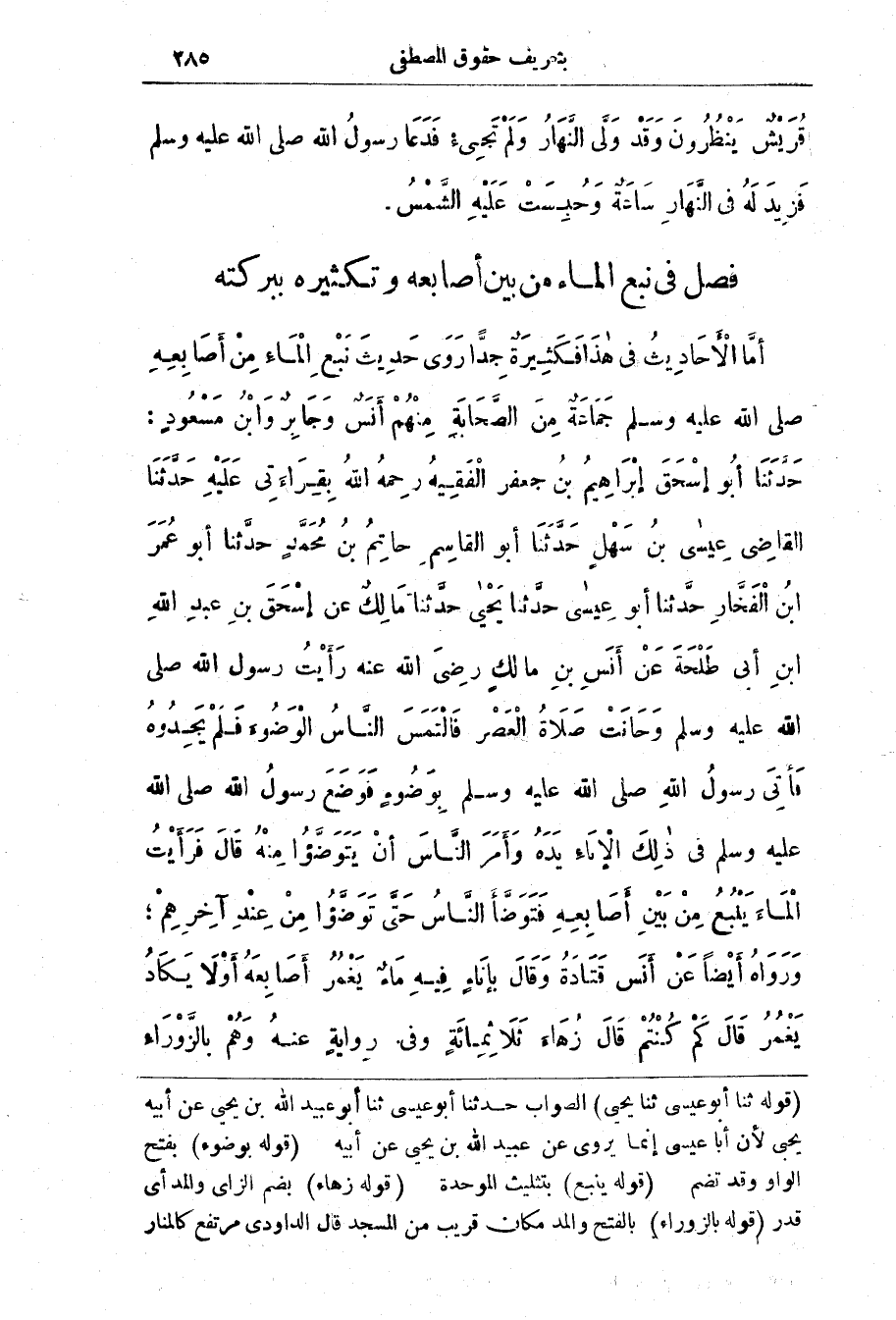 فصل فِي نبع الماء من بين أصابعه وتكثير ببركته أَمَّا الْأَحَادِيثُ فِي هَذَا فَكَثِيرَةٌ جِدًّا رَوَى حَدِيث نَبْعِ الْمَاءِ من أَصَابعِهِ صَلَّى اللَّهُ عَلَيْهِ وَسَلَّمَ جَمَاعَةٌ مِنَ الصَّحَابَةِ مِنْهُمْ أَنَسٌ وَجَابِرٌ وَابْنُ مَسْعُودٍ: حَدَّثَنَا أَبُو إِسْحَاقَ إبْرَاهِيمُ بْنُ جَعْفَرٍ الْفَقِيهُ رَحِمَهُ اللَّهُ بِقِرَاءَتِي عَلَيْهِ حَدَّثَنَا الْقَاضِي عِيسَى بْنُ سَهْلٍ حَدَّثَنَا أَبُو الْقَاسِمِ حَاتِمُ بْنُ مُحَمَّدٍ حَدَّثَنَا أَبُو عمر ابن الفَخَّارِ حَدَّثَنَا أَبُو عِيسَى حَدَّثَنَا يَحْيَى حَدَّثَنَا مالك عن إِسْحَاقَ بْنِ عَبْدِ الله ابن أَبِي طَلْحَةَ عَنْ أَنَسِ بْنِ مَالِكٍ رَضِيَ اللَّهُ عَنْهُ رَأَيْتُ رَسُولَ اللَّهِ صَلَّى اللَّهُ عَلَيْهِ وَسَلَّمَ وَحَانَتْ صَلاةُ الْعَصْرِ فَالْتَمَسَ النَّاسُ الْوَضُوءَ فَلَمْ يَجِدُوهُ فَأُتِيَ رَسُولُ اللَّهِ صَلَّى اللَّهُ عَلَيْهِ وَسَلَّمَ بِوَضُوءٍ فَوَضَعَ رَسُولُ اللَّهِ صَلَّى اللَّهُ عَلَيْهِ وَسَلَّمَ فِي ذَلِكَ الإِنَاءِ يَدَهُ وَأَمَرَ النَّاسَ أن يتوضؤا مِنْهُ قَالَ فَرَأَيْتُ الْمَاءَ يَنْبُعُ مِنْ بَيْنِ أَصَابِعِهِ فَتَوَضَّأَ الناس حتى توضؤا مِنْ عِنْدَ آخِرِهِمْ، وَرَوَاهُ أَيْضًا عَنْ أَنَسٍ قَتَادَةُ وَقَالَ بِإِنَاءٍ فِيهِ مَاءٌ يَغْمُرُ أَصَابِعَهُ أَوْ لَا يَكَادُ يَغْمُرُ قَالَ كَمْ كُنْتُمْ قال زهاء ثلاثمائة وَفِي رِوَايَةٍ عَنْهُ وهم بالزوراء