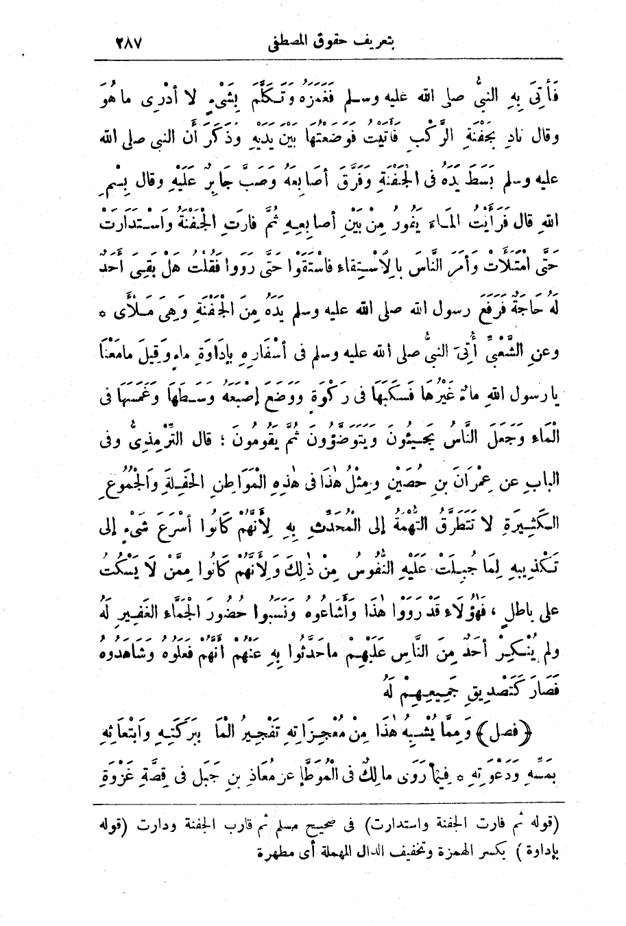 فَأُتِيَ بِهِ النَّبِيّ صَلَّى اللَّهُ عَلَيْهِ وَسَلَّمَ فَغَمَزَهُ وَتَكَلَّمَ بشئ لَا أَدْرِي مَا هُوَ وَقَالَ نَادِ بِجَفْنَةِ الرَّكْبِ فَأَتَيْتُ فوضعتها بَيْنَ يَدَيْهِ وَذَكَرَ أَنَّ النَّبِيّ صَلَّى اللَّهُ عَلَيْهِ وَسَلَّمَ بَسَطَ يَدَهُ فِي الْجَفْنَةِ وَفَرَّقَ أَصَابِعَهُ وَصَبَّ جَابِرٌ عَلَيْهِ وَقَالَ بِسْمِ اللَّه قَالَ فَرَأَيْتُ الْمَاءَ يَفُورُ من بَيْنِ أَصَابِعِهِ ثم فارته الْجَفْنَةُ وَاسْتَدَارَتْ حَتَّى امْتَلَأتْ وَأَمَرَ النَّاسَ بِالاسْتِقَاءِ فَاسْتَقَوا حَتَّى رَوُوا فَقُلْتُ هَلْ بَقِيَ أَحَدٌ لَهُ حَاجَةٌ فَرَفَعَ رَسُولُ الله صلى الله عَلَيْهِ وَسَلَّمَ يَدَهُ مِنَ الْجَفْنَةِ وَهِيَ مَلْأَى * وَعَنِ الشَّعْبِيّ أُتِيَ النَّبِيّ صَلَّى اللَّهُ عَلَيْهِ وَسَلَّمَ فِي أَسْفَارِهِ بِإِدَاوَةِ مَاءٍ وَقِيلَ مَا مَعَنَا يَا رَسُولَ اللَّهِ مَاءٌ غَيْرَهَا فَسَكَبَهَا فِي رَكْوَةٍ وَوَضَعَ إِصْبَعَهُ وَسَطَهَا وَغَمَسَهَا فِي الْمَاءِ وَجَعَلَ النَّاسُ يَجِيئُونَ ويتوضؤن ثُمَّ يَقُومُونَ، قَالَ الترْمِذيّ وَفِي الْبَابِ عَنْ عِمْرَانَ بن حُصَيْنٍ وَمِثْلُ هَذَا فِي هَذِهِ الْمَوَاطِنِ الْحَفِلَةِ وَالْجُمُوعِ الْكَثِيرَةِ لَا تَتَطَرَّقُ التُّهْمَةُ إِلَى الْمُحَدَّثِ بِهِ لِأَنَّهُمْ كَانُوا أَسْرَعَ شئ إِلَى تَكْذِيبِهِ لِما جُبِلَتْ عَلَيْهِ النُّفُوسُ من ذَلِكَ وَلِأَنَّهُمْ كَانُوا مِمَّنْ لَا يَسْكُتُ عَلَى بَاطِلٍ، فَهَؤْلَاءِ قَدْ رَوَوْا هَذَا وَأَشَاعُوهُ وَنَسَبُوا حُضُورَ الْجَمَّاءِ الْغَفِيرِ لَهُ وَلَمْ ينْكِرْ أَحَدٌ مِنَ النَّاسِ عَلَيْهِم مَا حَدَّثُوا بِهِ عَنْهُمْ أَنَّهُمْ فَعَلُوهُ وَشَاهَدُوهُ فَصَارَ كَتَصْدِيقِ جَمِيعِهِمْ لَهُ