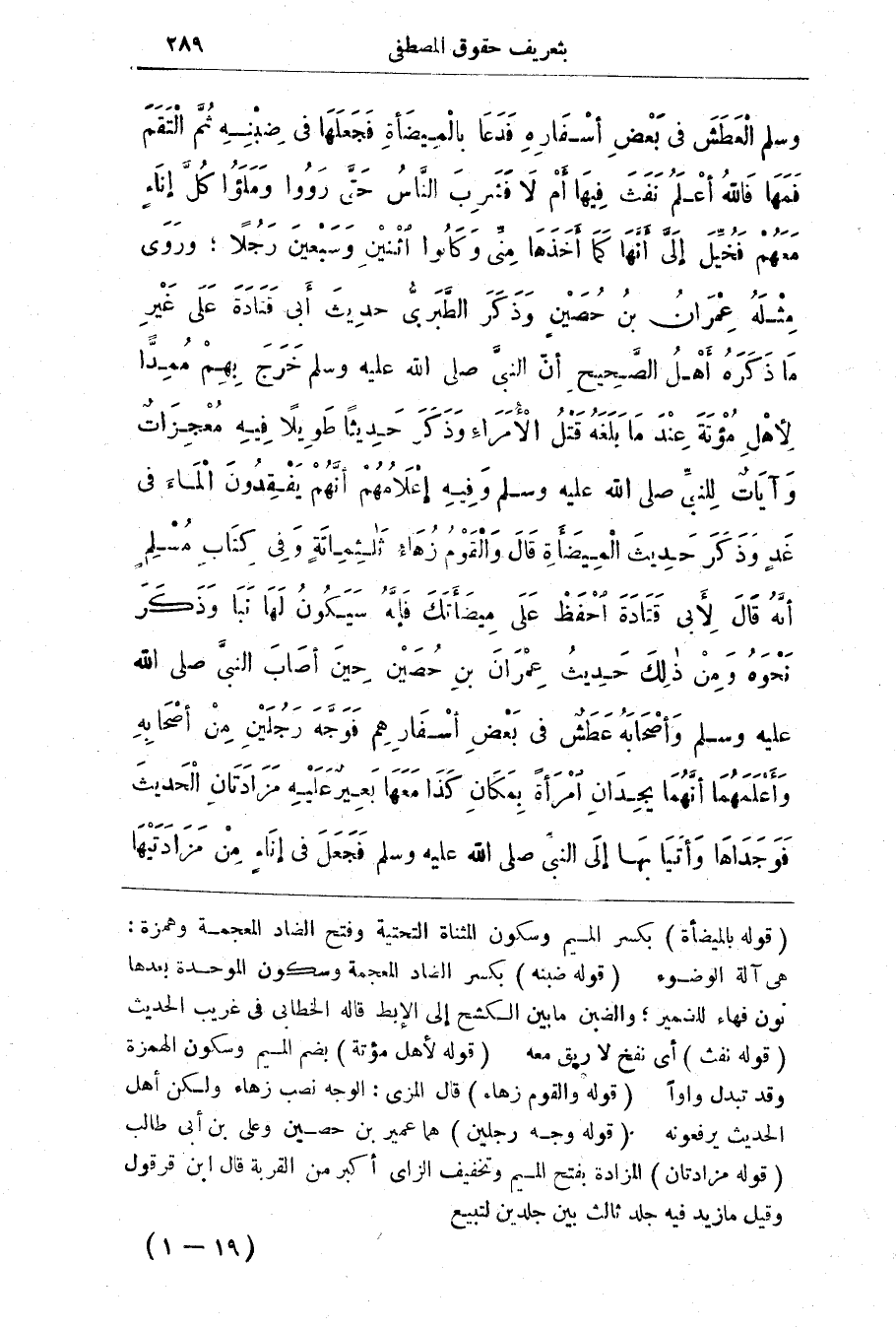 وَسَلَّمَ الْعَطَشَ فِي بَعْضِ أَسْفَارِهِ فَدَعَا بِالْمِيضَأةِ فَجَعلَهَا فِي ضِبْنِهِ ثُمَّ الْتَقَمَ فَمَهَا فَالله أَعْلَمُ نَفَثَ فِيهَا أَمْ لَا فَشَرِبَ النَّاسُ حتى رووا وملوا كُلَّ إنَاءٍ مَعَهُمْ فَخُيّلَ إِلَيَّ أنَّهَا كَمَا أَخَذَهَا مِنّي وَكَانُوا اثْنَيْنِ وَسبْعِينَ رَجُلًا، وَرَوَى