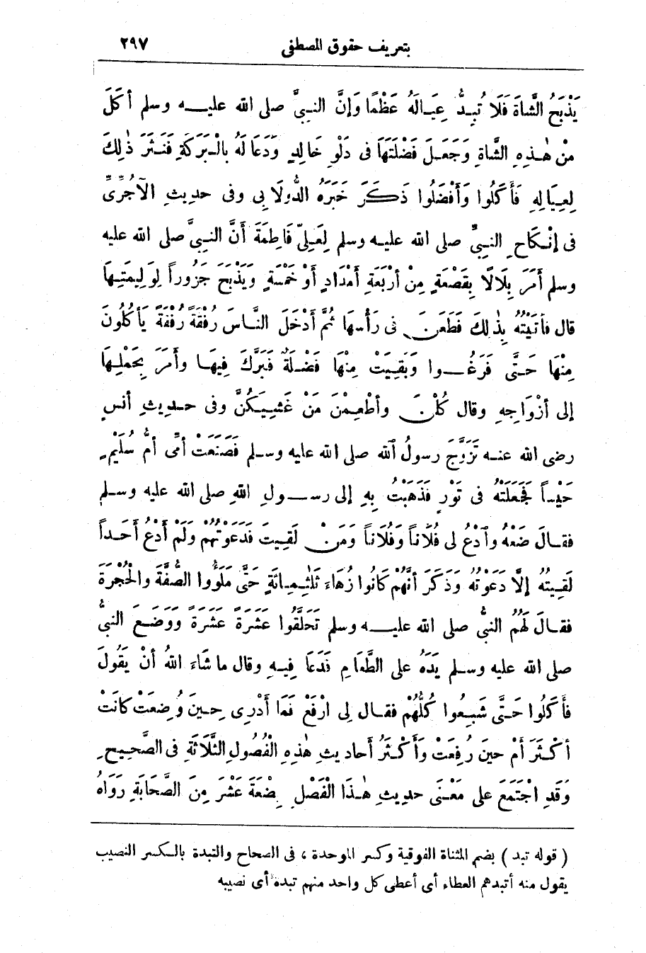 يَذْبَحُ الشَّاةَ فَلَا تُبِدُّ عِيَالَهُ عَظْمًا وَإنَّ النَّبِيّ صَلَّى اللَّهُ عَلَيْهِ وَسَلَّمَ أَكَلَ من هَذِهِ الشَّاةِ وَجَعَلَ فَضْلَتَهَا فِي دَلْوِ خَالِدٍ وَدَعَا لَهُ بِالبَرَكَةِ فَنَثَرَ ذَلِكَ لِعِيَالِهِ فَأَكَلُوا وَأَفضَلُوا ذَكَرَ خَبَرَهُ الدُّولَابِي وَفِي حَدِيث الآجُرّيّ فِي إِنْكَاحِ النَّبِيّ صَلَّى اللَّهُ عَلَيْهِ وَسَلَّمَ لِعَلِيّ فَاطِمَةَ أن النَّبِيّ صَلَّى اللَّهُ عَلَيْهِ وَسَلَّمَ أَمَرَ بِلَالًا بِقَصْعَةٍ من أَرْبَعَةِ أَمْدَادٍ أَوْ خمسة ويذبح جوزرا لوليتها قَالَ فَأَتَيْتُهُ بِذَلِكَ فَطَعَنَ فِي رَأْسِهَا ثُمَّ أَدْخَلَ النَّاسِ رُفْقَةً رُفْقَةً يَأْكُلُونَ مِنْهَا حَتَّى فَرغُوا وَبَقِيتْ مِنْهَا فَضْلَةٌ فَبَرَّكَ فِيهَا وَأَمَرَ بِحَمْلِهَا إِلَى أَزْوَاجِهِ وَقَالَ كُلْنَ وَأَطْعمْنَ من غَشِيَكُنَّ وَفِي حَدِيث أَنَسٍ رَضِيَ اللَّه عَنْهُ تَزَوَّجَ رَسُولُ اللَّه صَلَّى اللَّهُ عَلَيْهِ وَسَلَّمَ فَصَنَعَتْ أُمّي أُمُّ سُلَيْمٍ حَيْسًا فَجَعَلَتْهُ فِي تَوْرٍ فَذَهَبْتُ بِهِ إِلَى رَسُول اللَّه صَلَّى اللَّهُ عَلَيْهِ وَسَلَّمَ فَقَالَ ضَعْهُ وَادْعُ لِي فُلَانًا وَفُلَانًا وَمِنْ لَقِيتَ فَدَعَوْتُهُمْ وَلَمْ أَدَعْ أَحَدًا لَقيتُهُ إلَّا دَعَوْتُهُ وَذَكَرَ أَنَّهُمْ كَانُوا زُهَاءَ ثلثمائة حتى ملؤوا الصُّفَّةَ وَالْحُجْرَةَ فَقَالَ لَهُمُ النَّبِيّ صَلَّى اللَّهُ عَلَيْهِ وَسَلَّمَ تَحَلَّقُوا عَشْرَةً عَشْرةً وَوَضَعَ النَّبِيّ صَلَّى اللَّهُ عَلَيْهِ وَسَلَّمَ يَدَهُ عَلَى الطَّعَامِ فَدَعَا فِيهِ وَقَالَ مَا شَاءَ اللَّه أنْ يَقُول فَأَكَلُوا حَتَّى شَبِعُوا كُلُّهُمْ فَقَالَ لِي ارْفَعْ فَمَا أَدْرِي حِينَ وُضِعَتْ كَانَتْ