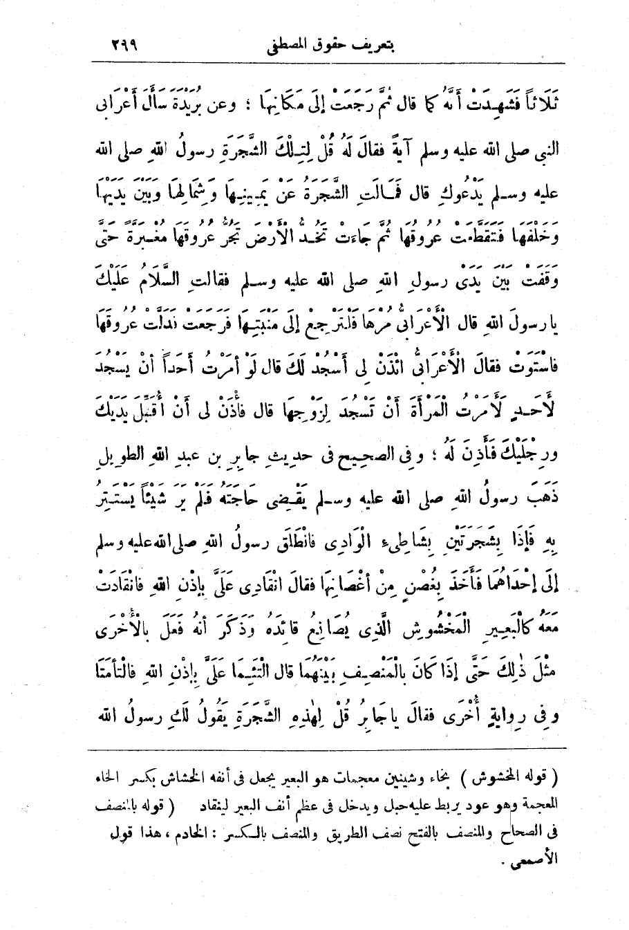 ثَلَاثًا فَشَهِدَتْ أنَّهُ كَمَا قَالَ ثُمَّ رَجَعَتْ إِلَى مَكَانِهَا، وَعَنْ بُرَيْدَةَ سَألَ أَعْرَابِيّ النَّبِيّ صَلَّى اللَّهُ عَلَيْهِ وَسَلَّمَ آيَةً فَقَالَ لَهُ قُلْ لِتِلْك الشَّجَرَةِ رَسُول اللَّه صَلَّى اللَّهُ عليه وسلم يدعوك قال فمالت الشَّجَرَةُ عَنْ يَمِينِهِا وَشِمَالِهَا وَبَيْنَ يَدَيْهَا وَخَلْفَهَا فَتَقَطَّعَتْ عُرُوقُهَا ثُمَّ جَاءَتْ تَخُدُّ الْأَرْض تَجُرُّ عُرُوقَهَا مُغْبَرَّةً حَتَّى وَقَفَتْ بَيْنَ يَدَيْ رَسُول الله صلى الله عَلَيْهِ وَسَلَّمَ فَقَالَتِ السَّلَامُ عَلَيْكَ يَا رَسُول اللَّه قَالَ الْأَعْرَابِيُّ مُرْهَا فَلْتَرْجِعْ إِلَى مَنْبَتِهَا فَرَجَعَتْ فَدَلَّتْ عُرُوقَها فَاسْتَوَتْ فَقَالَ الْأَعْرَابِيُّ ائْذَنْ لِي أَسْجُدْ لَكَ قَالَ لَوْ أَمَرْتُ أَحَدًا أَنْ يَسْجُدَ لِأَحَدٍ لَأمَرْتُ الْمَرْأَةَ أَنْ تَسْجُدَ لِزَوْجِهَا قَالَ فَأذن لِي أَنْ أُقَبّلَ يَدَيْكَ وَرِجْلَيْكَ فَأذِنَ لَهُ، وَفِي الصَّحِيحِ فِي حَدِيثِ جَابِرِ بن عَبدِ اللَّه الطَّوِيلِ ذَهَبَ رَسُولُ اللَّه صَلَّى اللَّهُ عَلَيْهِ وَسَلَّمَ يَقْضِي حَاجَتَهُ فَلَمْ يَرَ شَيْئًا يَسْتَتِرُ بِهِ فَإِذَا بِشَجَرَتَيْنِ بِشَاطِئِ الْوَادِي فَانْطَلَقَ رَسُولُ اللَّه صَلَّى اللَّهُ عَلَيْهِ وَسَلَّمَ إِلَى إِحْدَاهُمَا فَأَخَذَ بِغُصْنٍ من أَغْصَانِهَا فَقَالَ انْقَادِي عَليَّ بِإذْنِ اللَّه فَانْقَادَتْ مَعَهُ كَالْبَعِيرِ الْمَخْشُوشِ الَّذِي يُصَانِعُ قَائِدَهُ وَذَكَرَ أنَّهُ فَعَلَ بِالْأُخْرَى مِثْل ذَلِكَ حَتَّى إذَا كَانَ بِالْمَنْصِفِ بَيْنَهُمَا قَالَ الْتَئِمَا عَليَّ بِإذْنِ اللَّه فَالْتَأمَتَا وَفِي رِوَايَة أُخْرَى فَقَالَ يَا جَابِرُ قُلْ لِهَذِهِ الشَّجَرَةِ يَقُولُ لَكَ رَسُولُ الله
