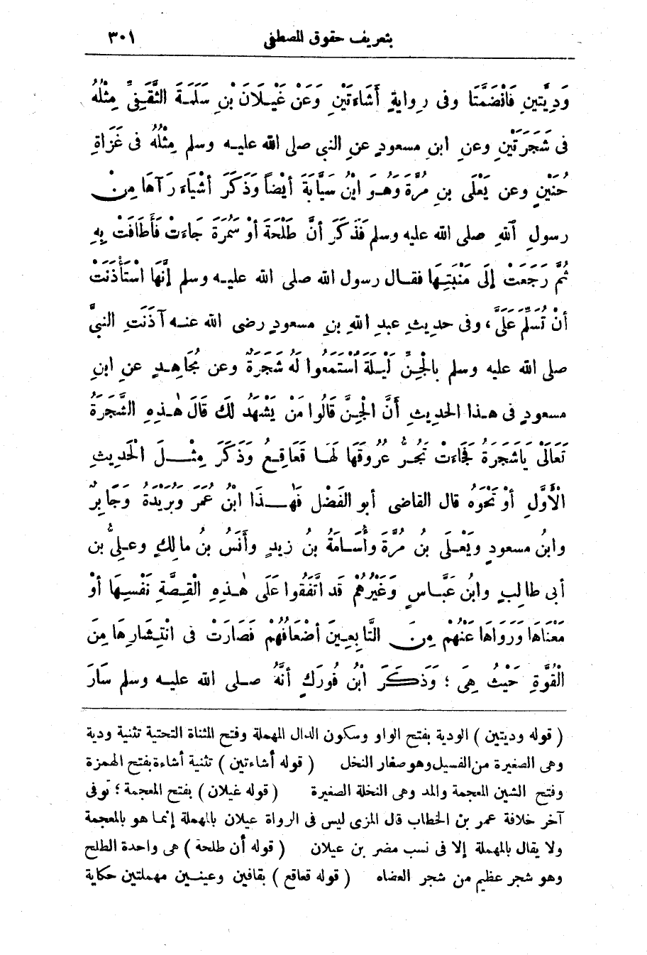 وَدِيَّتَينِ فَانْضَمَّتا وَفِي رِوَايَةِ أَشَاءَتَيْنِ وَعَنْ غَيْلَانَ بن سَلَمَةَ الثَّقَفِيّ مِثْلهُ فِي شَجَرَتَيْنِ وَعَنِ ابن مسعود عن النبي صلى الله عليه وَسَلَّمَ مِثْلهُ فِي غَزَاةِ حُنَيْنٍ وَعَنْ يَعْلَى بن مُرَّةَ وَهُوَ ابن سَيَّابَةَ أيْضًا وَذَكَرَ أَشْيَاءَ رَآهَا من رَسُول اللَّه صَلَّى اللَّهُ عَلَيْهِ وَسَلَّمَ فَذَكَرَ أَنَّ طَلْحَة أوْ سَمُرَة جَاءَتْ فَأَطَافَتْ بِهِ ثُمَّ رَجَعَتْ إِلَى مَنْبَتِهَا فقال رسول الله صلى الله عليه وَسَلَّمَ إنَّهَا اسْتَأذَنَتْ أنْ تُسَلّمَ عَليَّ، وَفِي حَدِيث عبد الله بن مسعود رضي الله عنه آذَنَتِ النَّبِيّ صَلَّى اللَّهُ عَلَيْهِ وَسَلَّمَ بِالْجِنّ لَيْلَةَ اسْتَمَعُوا لَهُ شَجَرَةٌ وَعَنْ مُجَاهِد عَنِ ابن مَسْعُودٍ فِي هَذَا الْحَدِيث أَنَّ الْجِنَّ قَالُوا من يَشْهَدُ لَكَ قَالَ هَذِهِ الشَّجَرَةُ تَعَالَيْ يَا شَجَرَةُ فَجَاءَتْ تَجُرُّ عُرُوقَهَا لَهَا قَعَاقِعُ وَذَكَرَ مِثْلَ الْحَدِيثِ الأَوَّلِ أَوْ نَحْوَهُ قَالَ الْقَاضِي أَبُو الْفَضْلِ فَهَذَا ابن عُمَرَ وَبُرَيْدَةُ وَجَابِرٌ وَابْنُ مَسْعُودٍ ويَعْلَى بن مُرَّةَ وَأُسَامَةُ بن زَيْدٍ وَأَنَسُ بن مَالِكٍ وَعَلِيُّ بن أَبِي طَالِبٍ وَابْنُ عَبَّاسٍ وَغَيْرُهُمْ قَدِ اتَّفَقُوا عَلَى هَذِهِ الْقِصَّةِ نَفْسِهَا أو مَعْنَاهَا وَرَوَاهَا عَنْهُمْ مِنَ التَّابِعِينَ أضافعهم فَصَارَتْ فِي انْتِشَارِهَا مِنَ الْقُوَّةِ حَيْثُ هِيَ، وَذَكَرَ ابن فُورَكٍ أنَّهُ صَلَّى اللَّهُ عَلَيْهِ وسلم سار