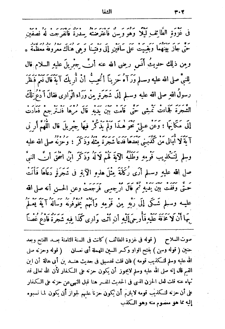 فِي غَزوَةِ الطَّائِفِ لَيْلًا وَهُوَ وسِنٌ فَاعْتَرَضَتْهُ سِدْرَةٌ فَانْفَرَجَتْ لَهُ نِصْفَيْنِ حَتَّى جَازَ بَيْنَهُمَا وَبَقِيَتْ عَلَى سَاقَيْنَ إِلَى وقتنا هي هُنَاكَ مَعْرُوفَةٌ مُعَظَّمَةٌ * وَمِنْ ذَلِكَ حَدِيث أَنَسٍ رَضِيَ اللَّه عَنْهُ أَنَّ جِبْرِيلَ عَلَيْهِ السَّلَامُ قَالَ لِلنَّبِيِّ صَلَّى اللَّهُ عَلَيْهِ وَسَلَّمَ وَرَآهُ حَزِينًا أَتُحِبُّ أنْ أُرِيكَ آيَةً قَالَ نَعَمْ فَنَظَرَ رَسُولُ اللَّه صَلَّى اللَّهُ عَلَيْهِ وَسَلَّمَ إِلَى شَجَرَةٍ من وَرَاءِ الْوَادِي فَقَالَ ادْعُ تِلْكَ الشَّجَرَةَ فَجَاءَتْ تَمْشِي حَتَّى قَامَتْ بَيْنَ يَدَيْهِ قَالَ مُرْهَا فَلْتَرْجِعْ فَعَادَتْ إِلَى مَكَانِهَا، وَعَنْ عَلِيّ نَحْو هَذَا وَلَمْ يَذْكُرْ فِيهَا جِبْرِيلَ قَالَ اللَّهُمَّ أَرِني آيَةً لَا أُبَالِي من كَذَّبَنِي بَعْدَهَا فَدَعَا شَجَرَةً مِثْلَهُ وَذَكَرَ، وحزنه صَلَّى اللَّهُ عَلَيْهِ وَسَلَّمَ لِتَكْذِيبِ قَوْمِهِ وطَلَبَهُ الآيَةَ لَهُمْ لَا لَهُ وَذَكَرَ ابن إِسْحَاق أَنَّ النَّبِيّ صَلَّى اللَّهُ عَلَيْهِ وَسَلَّمَ أَرَى رَكَانَةَ مِثْلَ هَذِهِ الآيَةِ فِي شَجَرَةٍ دَعَاهَا فَأَتَتْ حَتَّى وَقَفَتْ بَيْنَ يَدَيْهِ ثُمَّ قَالَ ارْجعِي فَرَجَعَتْ وَعَنِ الْحَسَنِ أنَّهُ صَلَّى اللَّهُ عليه وسلم شكى إِلَى رَبّه من قَوْمِهِ وَأَنَّهُمْ يُخَوّفُونَهُ وَسَأَلَهُ آيَةً يَعْلَمُ بِهَا أَنْ لَا مَخَافَةَ عَلَيْهِ فَأُوحِيَ إليْهِ أَنِ ائْتَ وَادِي كَذَا فِيهِ شَجَرَةٌ فَادْعُ غُصْنًا