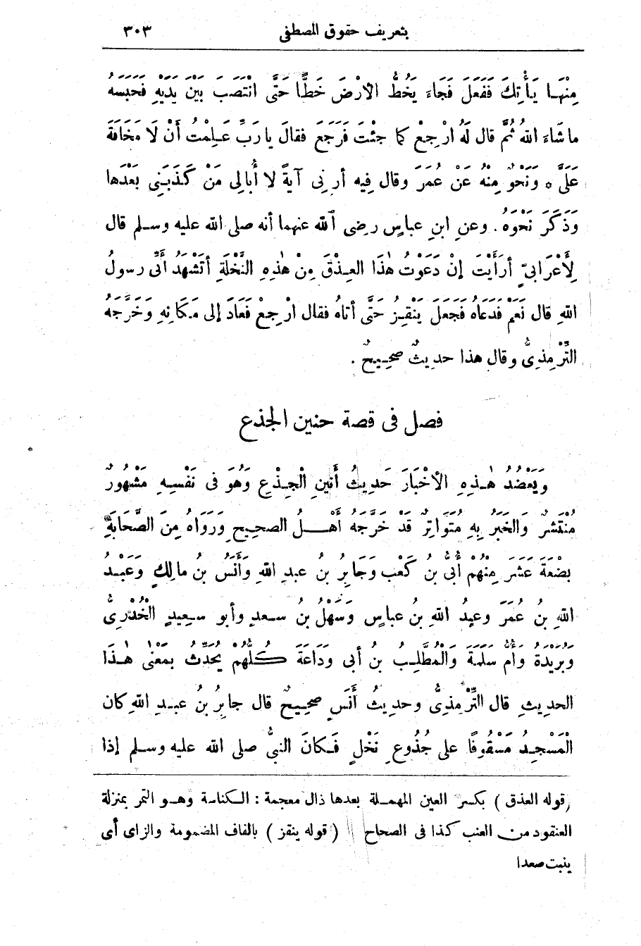 فصل فِي قِصَّةِ حنين الجذع وَيَعْضُدُ هَذِهِ الْأَخْبَار حَدِيث أَنِينِ الجِذْعِ وَهُوَ فِي نَفْسِهِ مَشْهُورٌ مُنْتَشِرٌ والخَبَرُ بِهِ مُتَواتِرٌ قَدْ خَرَّجَهُ أَهْلُ الصَّحِيحِ وَرَوَاهُ مِنَ الصَّحَابَةِ بِضْعَةَ عَشَر مِنْهُمْ أُبَيُّ بن كَعْب وَجَابِرُ بن عَبُدَ اللَّه وَأَنَسُ بن مَالِكٍ وَعَبدُ اللَّه بن عُمَرَ وَعَبُدُ اللَّه بن عَبَّاسٍ وَسَهْلُ بن سَعْدٍ وَأَبُو سَعِيدٍ الْخُدْرِيُّ وَبُرَيْدَةُ وَأُمُّ سَلَمَةَ وَالْمُطَّلِبُ بن أَبِي وَدَاعَةَ كُلُّهُمْ يُحَدّثُ بِمَعْنَى هَذَا الْحَدِيث قَالَ الترْمِذيُّ وَحَدِيث أَنَسٍ صَحِيحٌ قَالَ جَابِرُ بن عَبدِ اللَّه كَانَ الْمَسْجِدُ مَسْقُوفًا عَلَى جُذُوعِ نَخْلٍ فَكَانَ النَّبِيّ صَلَّى اللَّهُ عَلَيْهِ وَسَلَّمَ إذا
