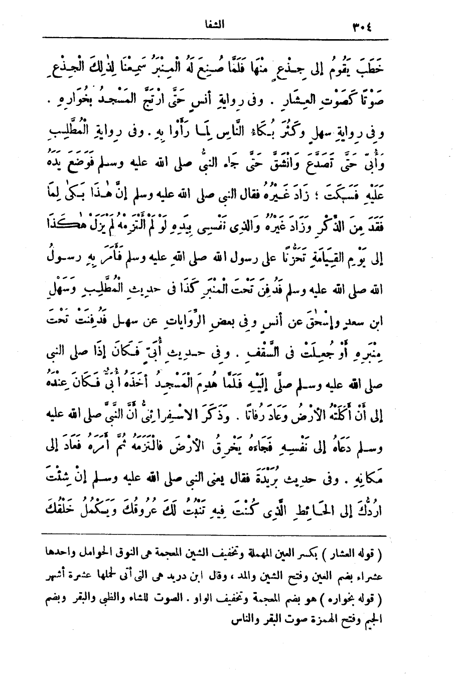 خَطَبَ يَقُومُ إِلَى جِذْعٍ مِنْهَا فَلَمّا صُنِعَ لَهُ المِنْبَرُ سَمِعْنَا لِذَلِكَ الْجِذْعِ صَوْتًا كَصَوْتِ العِشَارِ.