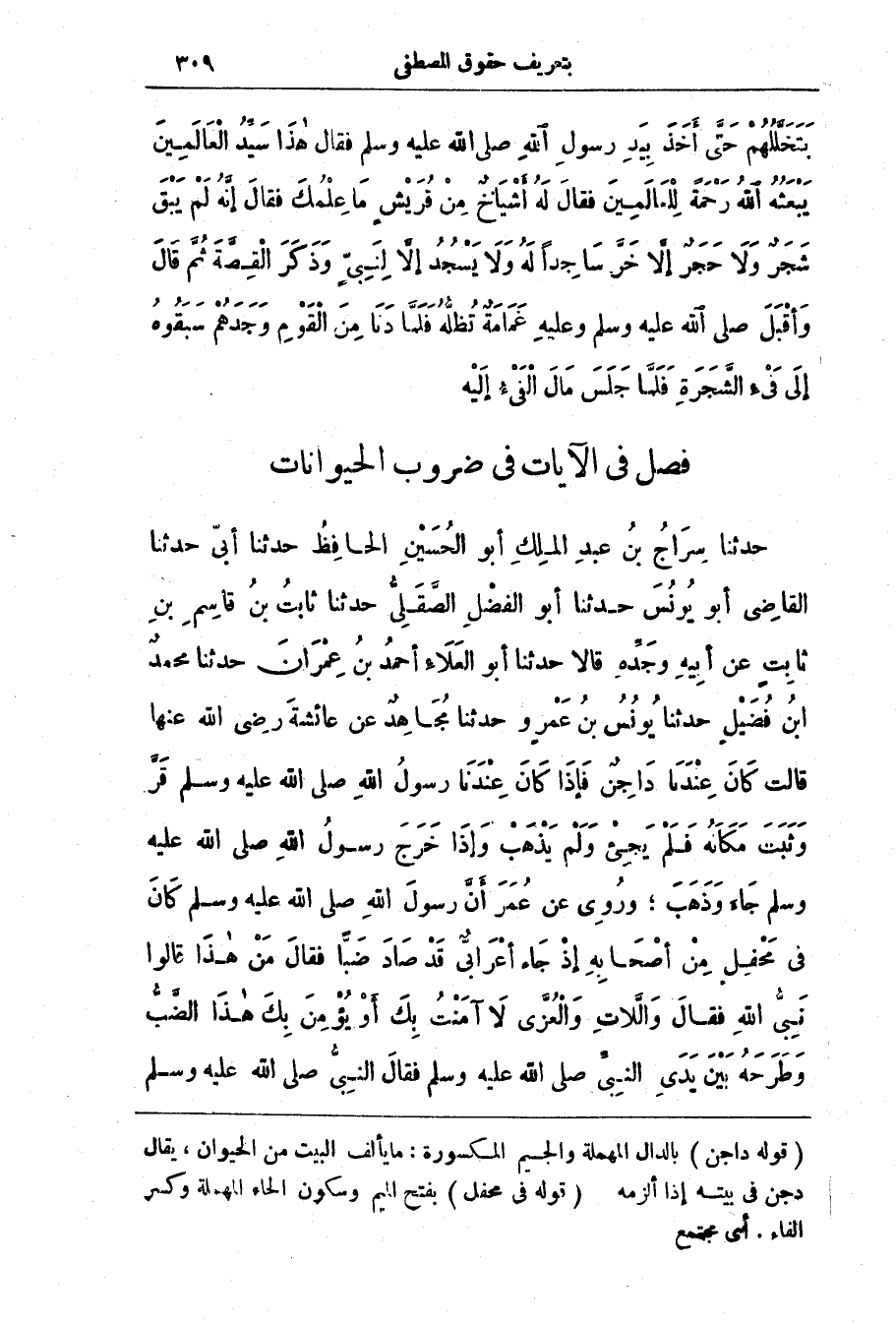 فصل فِي الآيات فِي ضروب الحيوانات حَدَّثَنَا سِرَاجُ بْنُ عَبْدِ المَلِكِ أَبُو الْحُسَيْنِ الحَافِظُ حَدَّثَنَا أَبِي حَدَّثَنَا القاضى أبو يُونسَ حَدَّثَنَا أَبُو الْفَضْلِ الصَّقَلِيُّ حَدَّثَنَا ثَابِتُ بْنُ قَاسِمِ بْنِ ثَابِتٍ عَنْ أبِيهِ وَجَدِّهِ قالا حَدَّثَنَا أَبُو العَلَاءِ أَحْمَدُ بْنُ عِمْرَانَ حدثنا محمد ابن فُضَيْلٍ حَدَّثَنَا يُونُسُ بْنُ عَمْرٍو حَدَّثَنَا مُجَاهِدٌ عَنْ عَائِشَةَ رَضِيَ اللَّهُ عَنْهَا قَالَتْ كَانَ عِنْدَنَا دَاجِنٌ فَإذَا كَانَ عِنْدَنَا رَسُولُ اللَّهِ صَلَّى اللَّهُ عَلَيْهِ وَسَلَّمَ قَرَّ وَثَبَتَ مَكَانَهُ فلم يحئ وَلَمْ يَذْهَبْ وَإذَا خَرَجَ رَسُولُ اللَّه صَلَّى اللَّهُ عَلَيْهِ وَسَلَّمَ جَاءَ وَذَهبَ، وَرُويَ عَنَ عُمَرَ أَنَّ رَسُول اللَّه صَلَّى اللَّهُ عَلَيْهِ وَسَلَّمَ كَانَ فِي مَحْفَلٍ من أَصْحَابِهِ إِذْ جَاءَ أَعْرَابِيٌّ قَدْ صَادَ ضَبًّا فَقَالَ من هَذَا قَالُوا