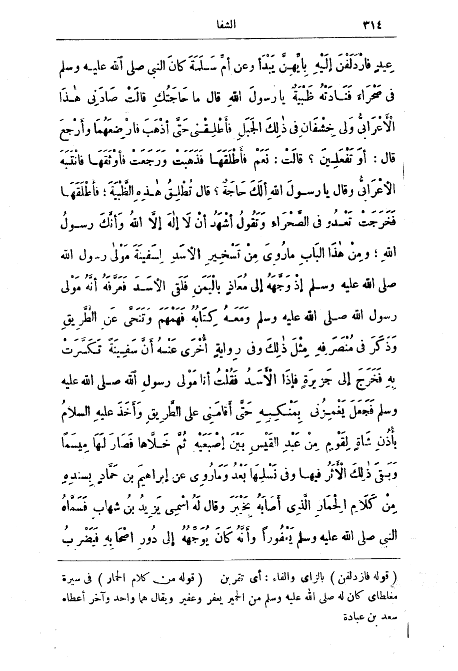 قَالَ: أوَ تَفْعَلِينَ؟ قَالَتْ: نَعَمْ فَأَطْلَقَهَا فَذَهَبَتْ وَرَجَعتْ فَأَوْثَقَهَا فَانْتَبَه الْأَعْرَابِيُّ وَقَالَ يَا رَسُولَ اللَّه أَلَكَ حَاجَةٌ؟ قَالَ تُطْلِقُ هَذِهِ الظَّبْية، فَأطْلَقَهَا فَخَرَجَتْ تَعْدُو فِي الصَّحْرَاءِ وَتَقُولُ أَشْهَدُ أنْ لَا إِلهَ إلَّا اللَّه وَأَنَّكَ رَسُولُ اللَّه، وَمِنْ هَذَا الْبَابِ مَا رُوِيَ من تَسْخِيرِ الأسَدِ لِسَفِينَة مَوْلَى رَسُولِ اللَّه صَلَّى اللَّهُ عَلَيْهِ وَسَلَّمَ إِذْ وَجَّهَهُ إِلَى مُعَاذٍ بِالْيَمَنِ فَلَقِيَ الأَسَدَ فَعَرَّفَهُ أنَّهُ مَوْلَى رَسُولِ اللَّه صَلَّى اللَّهُ عَلَيْهِ وَسَلَّمَ وَمَعَهُ كِتَابُهُ فَهَمْهَمَ وَتَنَحَّى عَنِ الطَّرِيقِ وَذَكَرَ فِي مُنْصَرفِهِ مِثْلَ ذَلِكَ وَفِي رِوَايَةٍ أُخْرَى عَنْهُ أَنَّ سَفِينَةً تَكَسَّرَتْ بِهِ فَخَرَج إِلَى جَزِيرَةٍ فَإِذَا الْأَسَدُ فَقُلْتُ أَنَا مَوْلَى رَسُولِ اللَّه صَلَّى اللَّهُ عَلَيْهِ وَسَلَّمَ فَجَعَلَ يَغْمِزُنِي بِمَنْكِبهِ حَتَّى أَقَامَنِي عَلَى الطَّرِيقِ وَأَخَذَ عَلَيْهِ السَّلَامُ بأُذُنِ شَاةٍ لِقَوْمٍ من عَبْدِ القَيْسِ بَيْنَ إِصْبَعَيْهِ ثُمَّ خَلَّاهَا فَصَارَ لَهَا ميسَمًا وَبَقِيَ ذَلِكَ الْأَثَرُ فِيهَا وَفِي نَسْلِهَا بَعْدُ وَمَا رُوِيَ عَنْ إبْرَاهِيمَ بن حَمَّادٍ بسندِهِ من كَلَامِ الحِمَارِ الَّذِي أَصَابَهُ بخَيْبَر وَقَالَ لَهُ اسْمِي يَزِيدُ بن شهابٍ فَسَمَّاهُ النَّبِيّ صَلَّى اللَّهُ عَلَيْهِ وَسَلَّمَ يعْفُورًا وَأنَّهُ كَانَ يُوَجّهُهُ إِلَى دُورِ اصحابه فيضرب