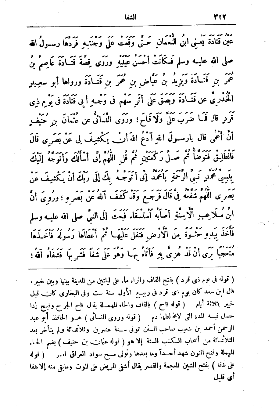 عَيْنُ قَتَادَةَ يَعْنِي ابْنَ النُّعْمَانِ حَتَّى وَقَعَتْ على وجنته فَرَدَّهَا رَسُولُ اللَّهِ صَلَّى اللَّهُ عَلَيْهِ وَسَلَّمَ فَكَانَتْ أَحْسَنَ عَيْنَيْهِ وَرَوَى قِصَّةَ قَتَادَةَ عَاصِمُ بن عُمَرَ بن قَتَادَةَ وَيَزِيِدُ بن عِيَاضِ بن عُمَرَ بن قَتَادَةَ وَرَوَاهَا أَبُو سَعِيدٍ الْخُدْرِي عَنْ قَتَادَةَ وَبصَقَ عَلَى أثَرِ سَهْمِ فِي وَجْهِ أَبِي قَتَادَةَ فِي يَوْمِ ذِي قَرَدٍ قَالَ فَمَا ضَرَبَ عَلَيَّ وَلَا قَاحَ، وَرَوَى النَّسَائِيُّ عَنْ عُثْمَانَ بن حُنَيْفٍ أَنَّ أَعْمَى قَالَ يَا رَسُولَ اللَّه ادْعُ اللَّه أن يَكْشِفَ لِي عَنْ بَصَري قَالَ فَانْطَلِقْ فَتَوَضَّأ ثُمَّ صَلّ رَكْعَتَيْنِ ثُمَّ قُلِ اللَّهُمَّ إِنَّي أَسْأَلُكَ وَأَتَوَجَّهُ إِلَيْكَ بنبى مُحَمَّدٍ نَبيّ الرَّحْمَةِ يَا مُحَمَّدُ إِنّي أَتَوَجَّهُ بِكَ إِلَى رَبّكَ أنْ يَكْشِفَ عَنْ بَصَرِي اللَّهُمَّ شَفّعْهُ فِيَّ قَالَ فَرَجَعُ وَقَدْ كَشَفَ اللَّه عَنْ بَصَرِهِ، وَرُويَ أَنَّ ابن مُلَاعِبِ الْأَسِنَّةِ أَصَابَهُ اسْتسْقَاء فَبَعَثَ إِلَى النَّبِيّ صَلَّى اللَّهُ عَلَيْهِ وَسَلَّمَ فَأَخَذَ بِيَدِهِ حَثْوَةً مِنَ الْأَرْضِ فَتَفَلَ عَلَيْهَا ثُمَّ أَعْطَاها رَسُولَهُ فَأَخَذَهَا مُتَعَجِّبًا يَرَى أَنْ قَدْ هُزِئَ بِهِ فَأَتَاهُ بِهَا وهو على الشفا فَشَرِبَهَا فَشَفَاهُ اللَّه،