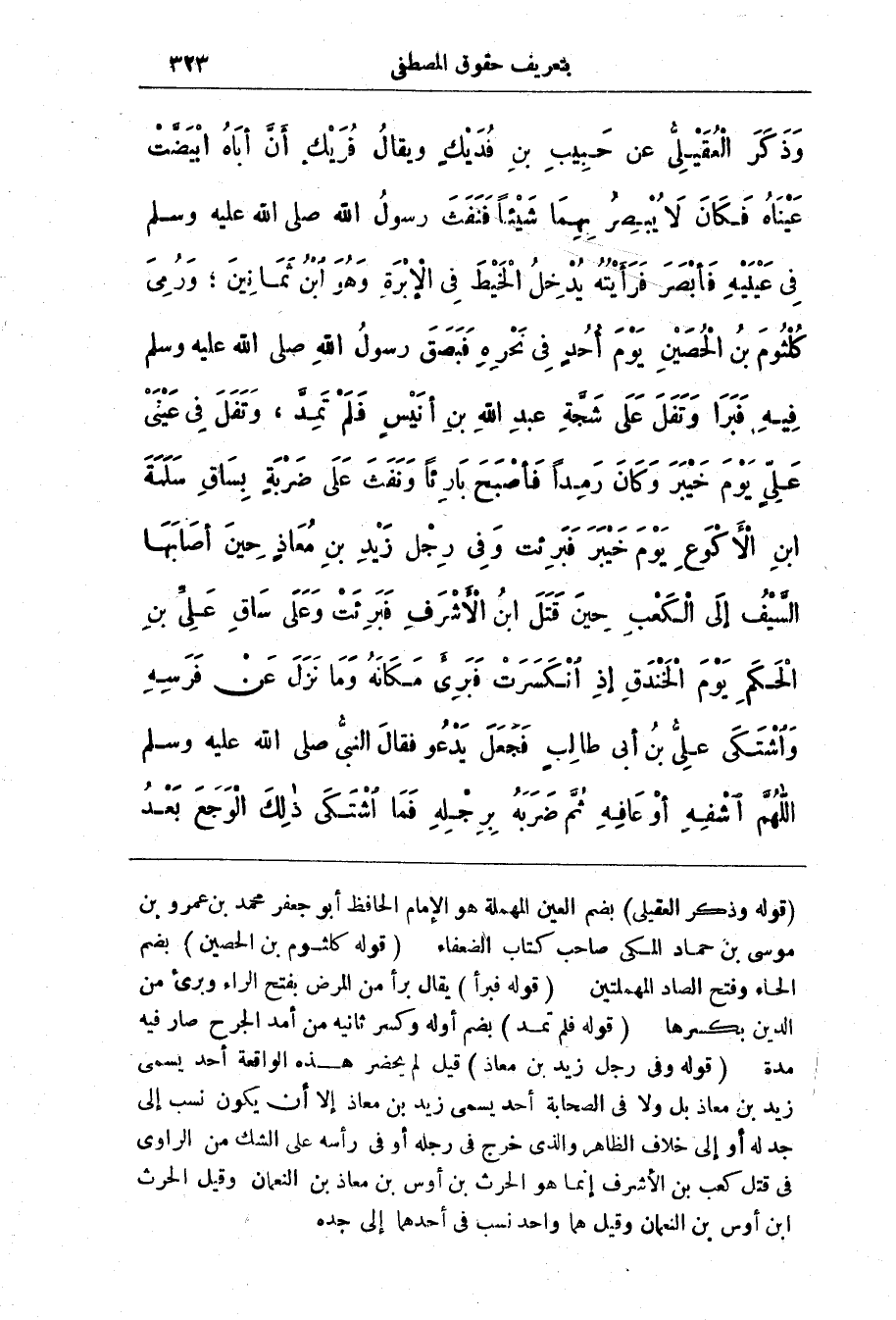 وَذَكَرَ الْعَقِيلِيُّ عَنْ حَبِيبِ بن فُدَيْكٍ ويقالُ فُرَيْكٍ أَنَّ أَبَاهُ ابْيَضَّتْ عَيْنَاهُ فَكَانَ لَا يُبْصِرُ بِهمَا شَيْئًا فَنَفَثَ رَسُولُ اللَّه صَلَّى اللَّهُ عَلَيْهِ وَسَلَّمَ فِي عَيْنَيْهِ فَأَبْصَرَ فَرَأَيْتُهُ يُدْخِلُ الْخَيْطَ فِي الْإِبْرَةِ وَهُوَ ابن ثَمَانِينَ، وَرُمِيَ كُلْثُومُ بن الْحُصَيْنِ يَوْمَ أُحُدٍ فِي نَحْرِهِ فَبَصَقَ رَسُولُ اللَّه صَلَّى اللَّهُ عَلَيْهِ وَسَلَّمَ فِيهِ فَبَرَأ وَتفل عَلَى شَجَّةِ عَبدِ اللَّه بن أُنَيْسٍ فَلَمْ تُمِدَّ، وَتَفَلَ فِي عَيْنَيْ عَلِيٍّ يَوْمَ خَيْبَرَ وَكَانَ رَمِدًا فَأَصْبَحَ بَارِئًا وَنَفَثَ عَلَى ضَرْبَةٍ بِسَاقِ سلمة ابن الأَكْوَعِ يَوْمَ خَيْبَرَ فَبَرِئت وَفِي رِجْل زَيْدِ بن مُعَاذٍ حِينَ أَصَابَهَا السَّيْفُ، إِلَى الْكَعْبِ حِينَ قَتَلَ ابن الْأَشْرَفِ فَبَرئَتْ وعلى سَاقِ عَلِيِّ بن الْحَكَمِ يَوْمَ الْخَنْدَقِ إِذ انْكَسَرَتْ فَبَرِئَ مَكَانَهُ وَمَا نَزَلَ عَنْ فَرَسِهِ وَاشْتَكى عَلِيُّ بن أَبِي طَالِبٍ فَجَعَلَ يَدْعُو فَقَالَ النَّبِيّ صَلَّى اللَّهُ عَلَيْهِ وَسَلَّمَ اللَّهُمَّ اشْفِهِ أَوْ عَافِهِ ثُمَّ ضَرَبَهُ بِرِجْلِهِ فَمَا اشْتَكَى ذَلِكَ الوجع بعد