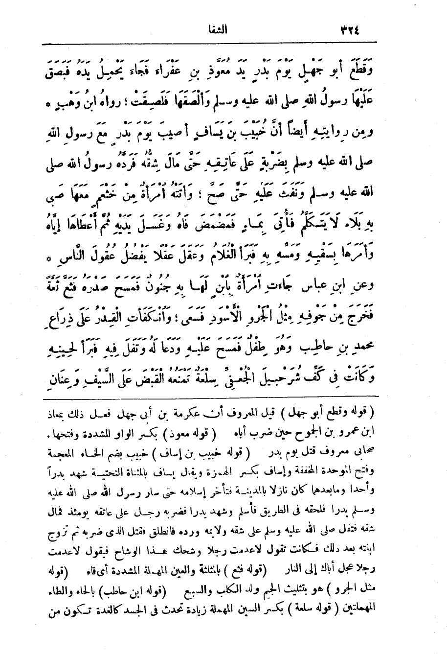 وَقَطَعَ أَبُو جَهْلٍ يَوْمَ بَدْرٍ يَدَ مُعَوِّذِ بن عَفْرَاءَ فَجَاءَ يَحْمِلُ يَدَهُ فَبصَقَ عَلَيْهَا رَسُولُ اللَّه صَلَّى اللَّهُ عَلَيْهِ وَسَلَّمَ وَأَلْصَقَهَا فَلَصِقَتْ، رَوَاهُ ابن وَهْبٍ * وَمِنْ رِوايتِهِ أيْضًا أَنَّ خُبَيْبَ بن يَسَافَ أصيبَ يَوْمَ بَدْر مَعَ رسول الله صلى الله عليه وسلم بِضَرْبَةٍ عَلَى عَاتِقِهِ حَتَّى مال شِقُّهُ فَرَدَّهُ رَسُولُ اللَّه صَلَّى اللَّهُ عَلَيْهِ وَسَلَّمَ وَنَفَثَ عَلَيْهِ حَتَّى صَحَّ، وَأَتَتْهُ امْرَأةٌ من خَثْعَمٍ مَعَهَا صَبِي بِهِ بَلَاء لَا يَتَكَلَّم فَأُتِيَ بِمَاءٍ فَمَضْمَضَ فَاهُ وَغَسَلَ يَدَيْهِ ثُمَّ أَعْطَاهَا إِيَّاهُ وَأَمَرَهَا بِسَقْيهِ وَمَسّهِ بِهِ فَبَرَأَ الْغُلَامُ وَعَقَلَ عَقْلًا يَفْضُلُ عُقُولَ النَّاسِ * وَعَنِ ابن عَبَّاس جَاءَتِ امْرَأَةٌ بِابْنٍ لَهَا بِهِ جُنُونٌ فَمَسَحَ صَدْرَهُ فَثَعَّ ثَعَّةً فَخَرَجَ من جَوْفِهِ مِثْلُ الْجَرْوِ الْأَسْوَدِ فَسعى، وَانْكَفَأتِ الْقِدْرُ عَلَى ذِرَاعِ مُحَمَّدِ بن حَاطِب وَهُوَ طِفْلٌ فَمَسَحَ عَلَيْهِ وَدَعَا لَهُ وَتَفَلَ فِيهِ فَبَرَأَ لحِينِهِ وَكَانَتْ فِي كَفّ شرحبيل الجعفي سلمة تَمْنَعُهُ الْقَبْضَ عَلَى السيف وعنان