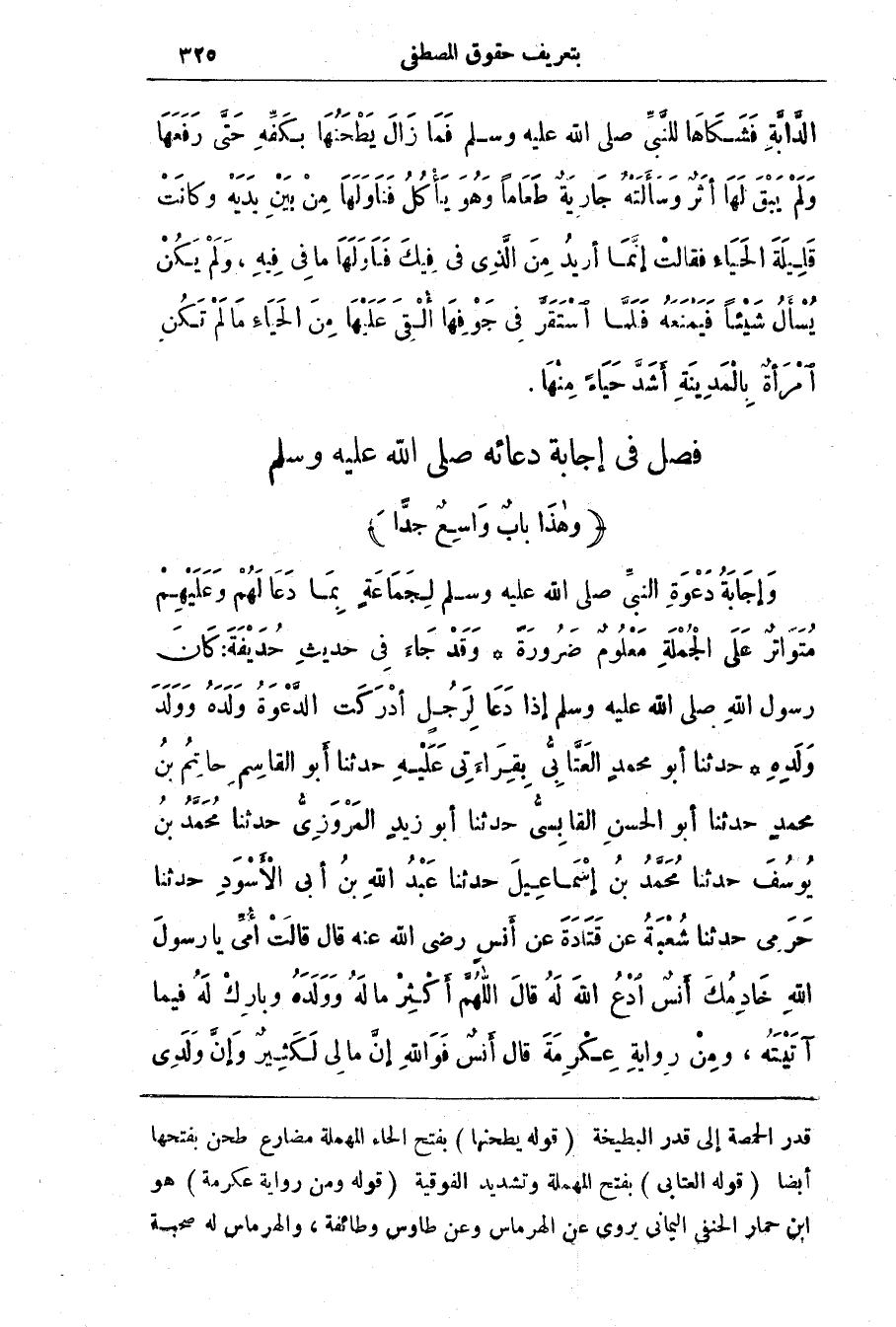 فصل فِي إجابة دعائه صَلَّى اللَّهُ عَلَيْهِ وَسَلَّمَ (وَهَذَا باب واسع جدًا) وَإِجَابَةُ دَعْوَةِ النَّبِيّ صَلَّى اللَّهُ عَلَيْهِ وَسَلَّمَ لِجَمَاعَةٍ بِمَا دَعَا لَهُمْ وَعَلَيْهِمْ مُتَوَاتِرٌ عَلَى الْجُمْلَةِ مَعْلُومٌ ضَرُورَةً * وَقَدْ جاء فِي حَدِيث حُذَيْفَةَ: كَانَ رَسُولُ اللَّه صَلَّى اللَّهُ عَلَيْهِ وَسَلَّمَ إذَا دَعَا لِرَجُلٍ أَدْرَكَتِ الدَّعْوَةُ وَلَدَهُ وَوَلَدَ وَلَدِهِ * حَدَّثَنَا أَبُو مُحَمَّدٍ العَتَّابِيُّ بِقِرَاءَتِي عَلَيْهِ حَدَّثَنَا أَبُو الْقَاسِمِ حَاتِمُ بن محمد حدثنا أبو الحسن القابسي حَدَّثَنَا أَبُو زَيْدٍ المروزي حدثنا محمد بن يُوسُفَ حَدَّثَنَا مُحَمَّدُ بْنُ إِسْمَاعِيلَ حَدَّثَنَا عَبْدُ اللَّهِ بْنُ أَبِي الْأَسْوَدِ حَدَّثَنَا