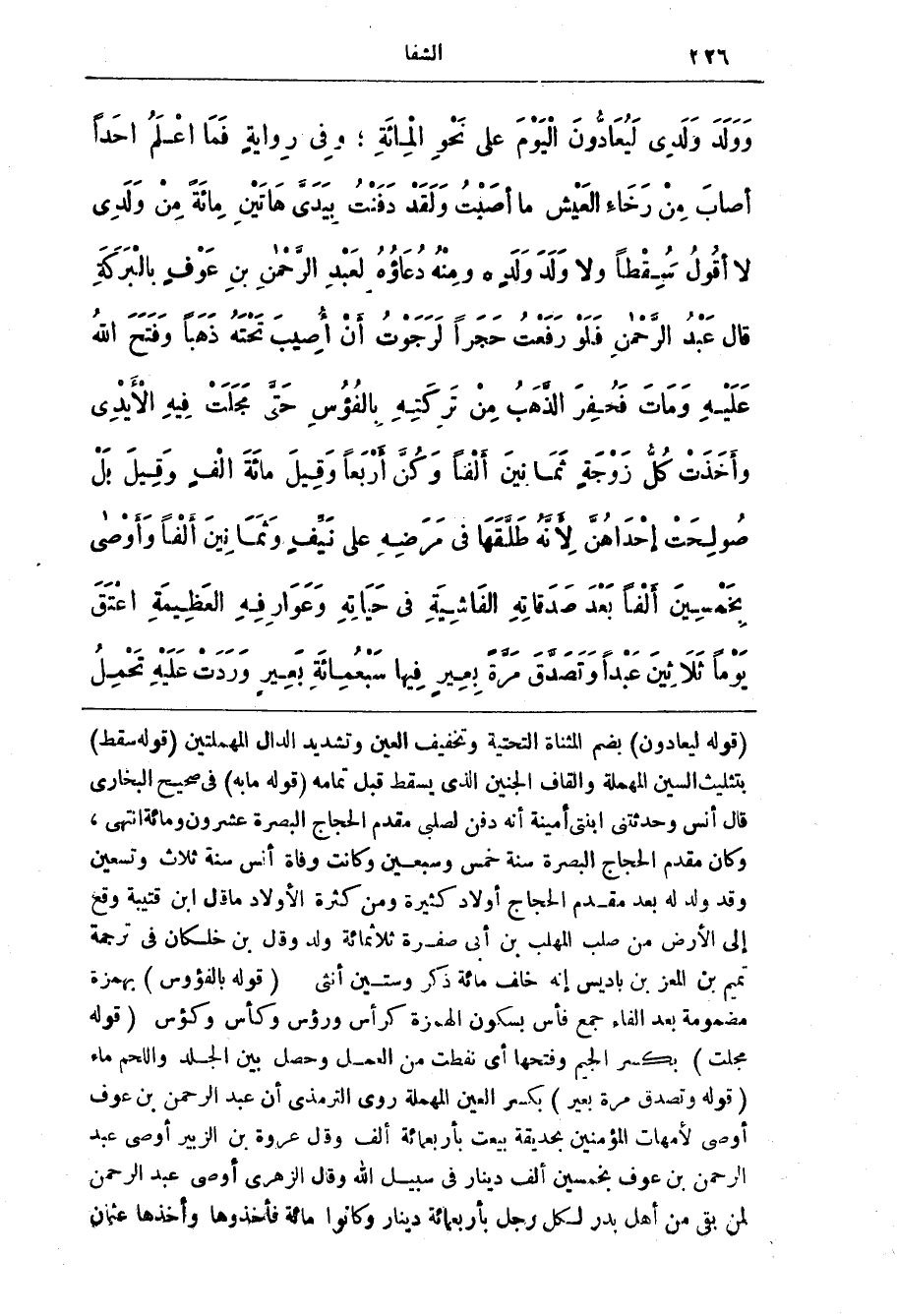 تميم بن المعز بن باديس إنه خلف مائة ذكر وستين أنثى (قوله بالفؤوس) بهمزة مضمومة بعد الفاء جمع فأس بسكون الهمزة كرأس ورؤس وكأس وكؤس (قوله مجلت) بكسر الجيم وفتحها أي نفطت من العمل وحصل بين الجلد واللحم ماء (قوله وَتَصَدَّقَ مَرَّةّ بعيرٍ) بكسر العين المهملة روى الترمذي أن عبد الرحمن بن عوف أوصى لأمهات المؤمنين بحديقة بيعت بأربعمائة ألف وَقَالَ عروة بن الزبير أوصى عبد الرحمن بن عوف بخمسين ألف دينار في سبيل الله وقال الزهري أوصى عبد الرحمن لمن بقى من أهل بدر لكل رجل بأربعمائة دينار وكانوا مائة فأخذوها وأخذها عثمان فيمن أخذ وأوصى بألف فرس في سبيل الله (*)