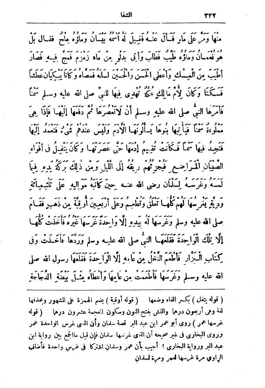 منها ومر مَاءٍ فَسَأَلَ عَنْهُ فَقِيلَ لَهُ اسْمُهُ بَيْسَانُ وماءه مِلْحٌ فَقَالَ بَلْ هو نعمان وماءه طَيّبٌ فَطَابَ وَأُتِيَ بِدَلْوٍ من مَاء زَمْزَمَ فَمَجَّ فِيهِ فَصَارَ أَطْيبَ مِنَ الْمِسْكِ وَأَعْطَى الْحَسَنَ وَالْحُسَيْنَ لِسَانَهُ فَمَصَّاهُ وَكَانَا يَبْكِيَانِ عَطَشًا فَسَكَتَا وَكَانَ لِأُمّ مَالِكٍ عُكَّةٌ تُهْدِي فِيهَا لِلنَّبِيِّ صَلَّى اللَّهُ عَلَيْهِ وَسَلَّمَ سَمْنًا فَأَمَرَهَا النَّبِيّ صلى الله عليه وسلم أن لا نعصرها ثُمَّ دَفَعَهَا إِلَيْهَا فَإِذَا هِيَ مَمْلُوءَةٌ سَمْنًا فَيَأْتِيهَا بَنُوهَا يَسْأَلُونَهَا الْأَدْمَ وَلَيْسَ عندهم شئ فَتَعْمَدُ إِلَيْهَا فَتَجِدُ فِيهَا سَمْنًا فَكَانَتْ تقسيم أدْمَهَا حَتَّى عَصَرَتْهَا وَكَانَ يَتْفُل فِي أَفْواهِ الصّبْيَانِ الْمَرَاضِعِ فيجزههم رِيقُهُ إِلَى اللَّيْلِ وَمِنْ ذَلِكَ بَرَكَةُ يَدِهِ فِيمَا لَمَسَهُ وَغَرَسَهُ لِسَلْمَانَ رَضِيَ اللَّه عَنْهُ حين كَاتَبَهُ مَوَالِيهِ عَلَى ثلثمائة وَدِيَّةٍ يَغْرِسُهَا لَهُمْ كُلُّهَا تَعْلَقُ وَتُطْعِمُ وَعَلَى أربعين أو قية من ذَهَبٍ فَقَامَ صَلَّى اللَّهُ عَلَيْهِ وَسَلَّمَ وَغَرَسَهَا لَهُ بِيَدِهِ إلَّا وَاحِدةً غَرَسَهَا غَيْرُهُ فَأَخَذَتْ كُلُّهَا إلَّا تِلْكَ الواحدة فقلعها النبي صَلَّى اللَّهُ عَلَيْهِ وَسَلَّمَ وَرَدَّهَا فَأَخَذَتْ وَفِي كِتَابِ الْبَزَّارِ فَأَطْعَمَ النَّخْلُ من عَامِهِ إلَّا الْوَاحِدَةَ فَقَلَعهَا رَسُولُ اللَّه صَلَّى اللَّهُ عَلَيْهِ وَسَلَّمَ وَغَرَسَهَا فاطمعت من عَامِهَا وَأَعْطَاهُ مِثْلَ بَيْضَةِ الدَّجَاجَةِ