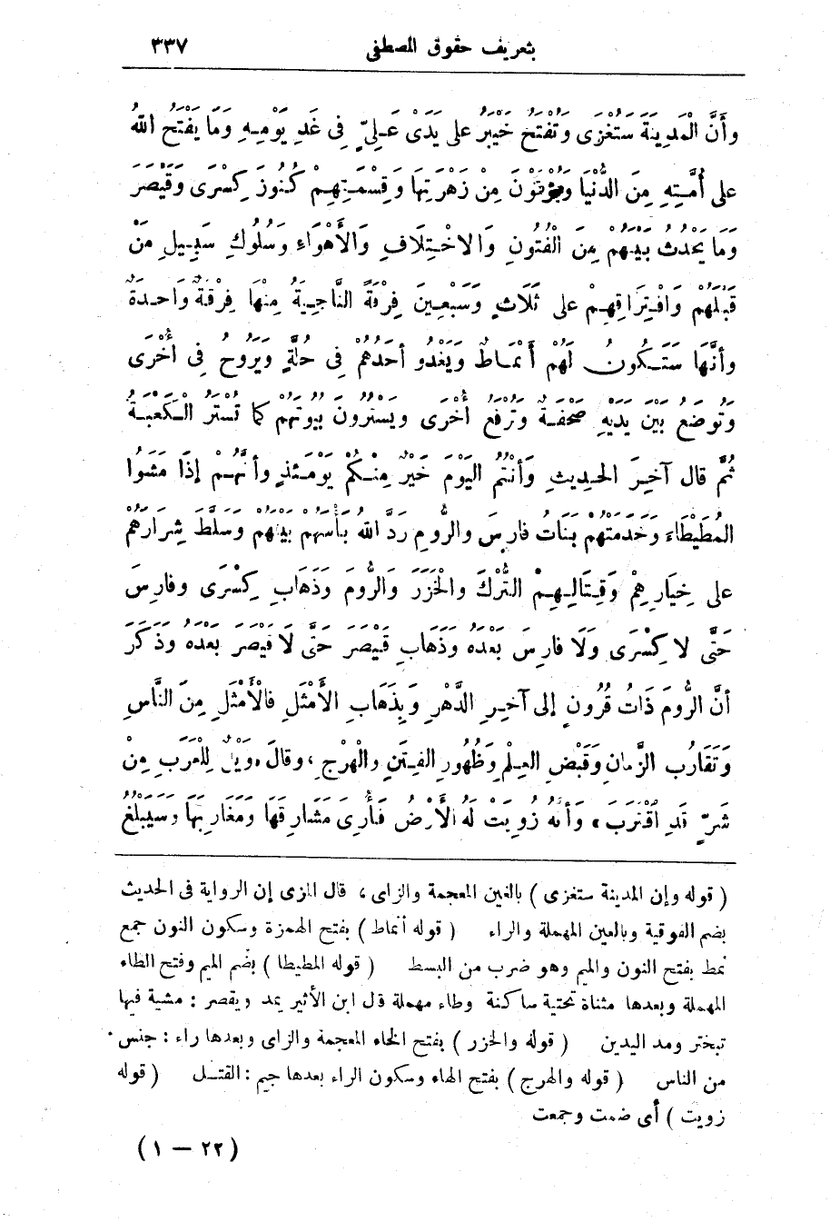 (قوله وَأَنَّ الْمَدِينةَ سَتُغْزَى) بالغين المعجمة والزاى، قال المزى إن الرواية في الحديث بضم الفوقية وبالعين المهملة والراء (قوله أنماط) بفتح الهمزة وسكون النون جمع نمط بفتح النون والميم وهو ضرب من البسط (قوله المطيطا) بضم الميم وفتح الطاء المهملة وبعدها مثناة تحتية ساكنة وطاء مهملة قال ابن الأثير يمد ويقصر: مشية فيها تبختر ومد اليدين (قوله والخزر) بفتح الخاء المعجمة والزاى وبعدها راء: جنس من الناس (قوله والهرج) بفتح الهاء وسكون الراء بعدها جيم: القتل (قوله زويت) أي ضمت وجمعت (22 - 1) (*)