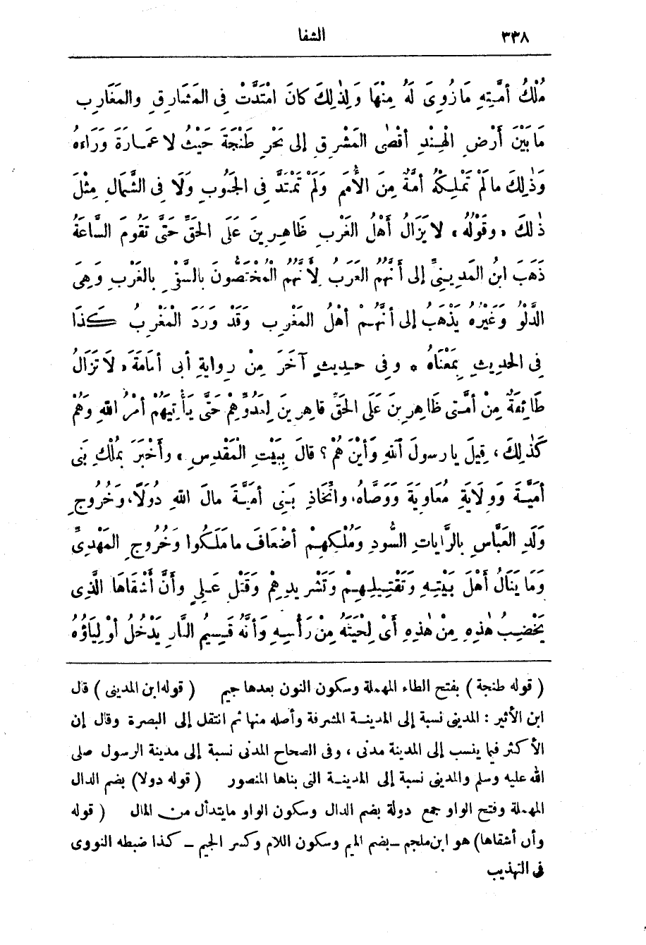 مُلْكُ أُمَّتِهِ مَا زُوِيَ لَهُ مِنْهَا ولذلك كَانَ امْتدَّتْ فِي المَشَارِقِ وَالْمَغَارِبِ مَا بَيْنَ أَرْضِ الْهِنْدِ أَقْصَى الْمَشْرِقِ إِلَى نحر طَنْجَةَ حَيْثُ لَا عِمَارَةَ وَرَاءَهُ وَذَلِكَ مَا لَمْ تَمْلِكْهُ أُمَّةٌ مِنَ الأُمَم وَلَمْ تَمْتَدَّ فِي الْجَنُوبِ وَلَا فِي الشَّمَال مِثْلَ ذَلِكَ (وَقَوْلُهُ) لَا يَزَالُ أهل الغرب ظَاهِرِينَ عَلَى الْحَقِّ حَتَّى تَقُومَ السَّاعَةُ ذَهَبَ ابْنُ المَدِينِي إِلَى أَنَّهُمُ الْعَرَبُ لِأَنَّهُمُ الْمُخْتَصُّونَ بِالسَّقْي بِالْغَرْبِ وَهِيَ الدَّلْوُ وَغَيْرُهُ يَذْهَبُ إِلَى أَنَّهُمْ أَهْلُ الْمَغْرِبِ وَقَدْ وَرَدَ الْمَغْرِبَ كَذَا فِي الْحَدِيثِ بِمَعْنَاهُ * وَفِي حَدِيث آخرَ من رِوَايَةِ أَبِي أُمَامَةَ (لَا تَزَالُ طَائِفَةٌ مِنْ أمتى ظاهر بن عَلَى الْحَقِّ قَاهِرِينَ لِعَدُوِّهِمْ حَتَّى يَأْتِيَهُمْ أَمْرُ اللَّهِ وَهُمْ