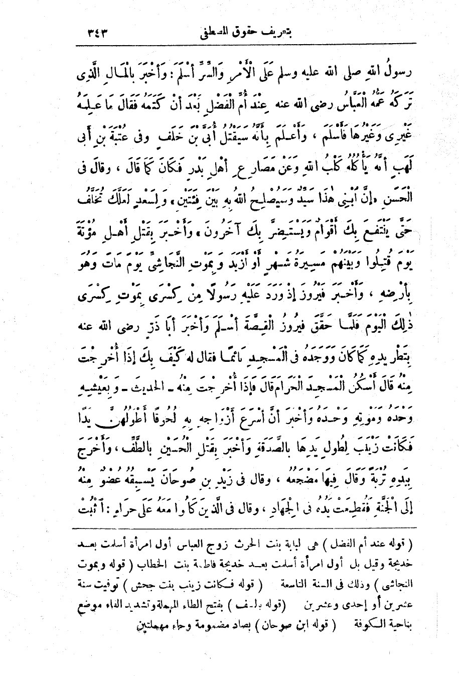 (قوله عِنْدَ أُمّ الْفَضْلِ) هي لبابة بنت الحرث زوج العباس أول امرأة أسلمت بعد خديجة وقيل بل أول امرأة أسلمت بعد خديجة فاطمة بنت الخطاب (قوله وبموت النجاشي) وذلك في السنة التاسعة (قوله فكانت زَيْنَب بِنت جَحْش) توفيت سنة عشرين أو إحدى وعشرين (قوله بالطف) بتفح الطاء المهملة وتشديد الفاء موضع بناحية الكوفة (قوله ابن صوحان) بصاد مضمومة وحاء مهملتين (*)