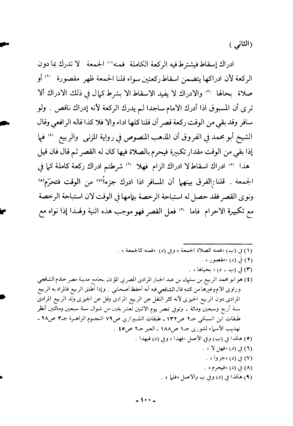 الثَّانِي) إدْرَاكُ إسْقَاطٍ فَيُشْتَرَطُ فِيهِ الرَّكْعَةُ الْكَامِلَةُ فَمِنْهُ الْجُمُعَةُ لَا تُدْرَكُ بِمَا دُونَ الرَّكْعَةِ لِأَنَّ إدْرَاكَهَا يَتَضَمَّنُ إسْقَاطُ رَكْعَتَيْنِ سَوَاءٌ قُلْنَا الْجُمُعَةُ ظُهْرٌ مَقْصُورَةٌ أَوْ صَلَاةٌ بِحَالِهَا وَالْإِدْرَاكُ لَا يُفِيدُ الْإِسْقَاطَ إلَّا بِشَرْطِ كَمَالٍ فِي ذَلِكَ الْإِدْرَاكِ. أَلَا تَرَى أَنَّ الْمَسْبُوقَ إذَا أَدْرَكَ الْإِمَامَ سَاجِدًا لَمْ يُدْرِكْ الرَّكْعَةَ لِأَنَّهُ إدْرَاكٌ نَاقِصٌ. وَلَوْ سَافَرَ وَقَدْ بَقِيَ مِنْ الْوَقْتِ رَكْعَةٌ قَصَرَ إنْ قُلْنَا كُلُّهَا أَدَاءٌ، وَإِلَّا فَلَا كَذَا قَالَهُ الرَّافِعِيُّ وَقَالَ الشَّيْخُ أَبُو مُحَمَّدٍ فِي الْفُرُوقِ إنَّ الْمَذْهَبَ الْمَنْصُوصُ فِي رِوَايَةِ الْمُزَنِيِّ وَالرَّبِيعِ فِيمَا إذَا بَقِيَ مِنْ الْوَقْتِ مِقْدَارُ تَكْبِيرَةٍ فَيُحْرِمُ بِالصَّلَاةِ فِيهَا كَانَ لَهُ الْقَصْرُ ثُمَّ قَالَ فَإِنْ قِيلَ هَذَا إدْرَاكُ إسْقَاطٍ لَا إدْرَاكُ إلْزَامٍ فَهَلَّا شَرَطْتُمْ إدْرَاكَ رَكْعَةٍ كَامِلَةٍ كَمَا فِي الْجُمُعَةِ. قُلْنَا: الْفَرْقُ بَيْنَهُمَا أَنَّ الْمُسَافِرَ إذَا أَدْرَكَ جُزْءًا مِنْ الْوَقْتِ فَتَحَرَّمَ وَنَوَى الْقَصْرَ فَقَدْ حَصَلَ لَهُ اسْتِبَاحَةُ الرُّخْصَةِ بِتَمَامِهَا فِي الْوَقْتِ لِأَنَّ اسْتِبَاحَةَ الرُّخْصَةِ مَعَ تَكْبِيرَةِ الْإِحْرَامِ فَأَمَّا فِعْلُ الْقَصْرِ فَهُوَ مُوجِبٌ هَذِهِ النِّيَّةَ وَلِهَذَا إذَا نَوَاهُ مَعَ
