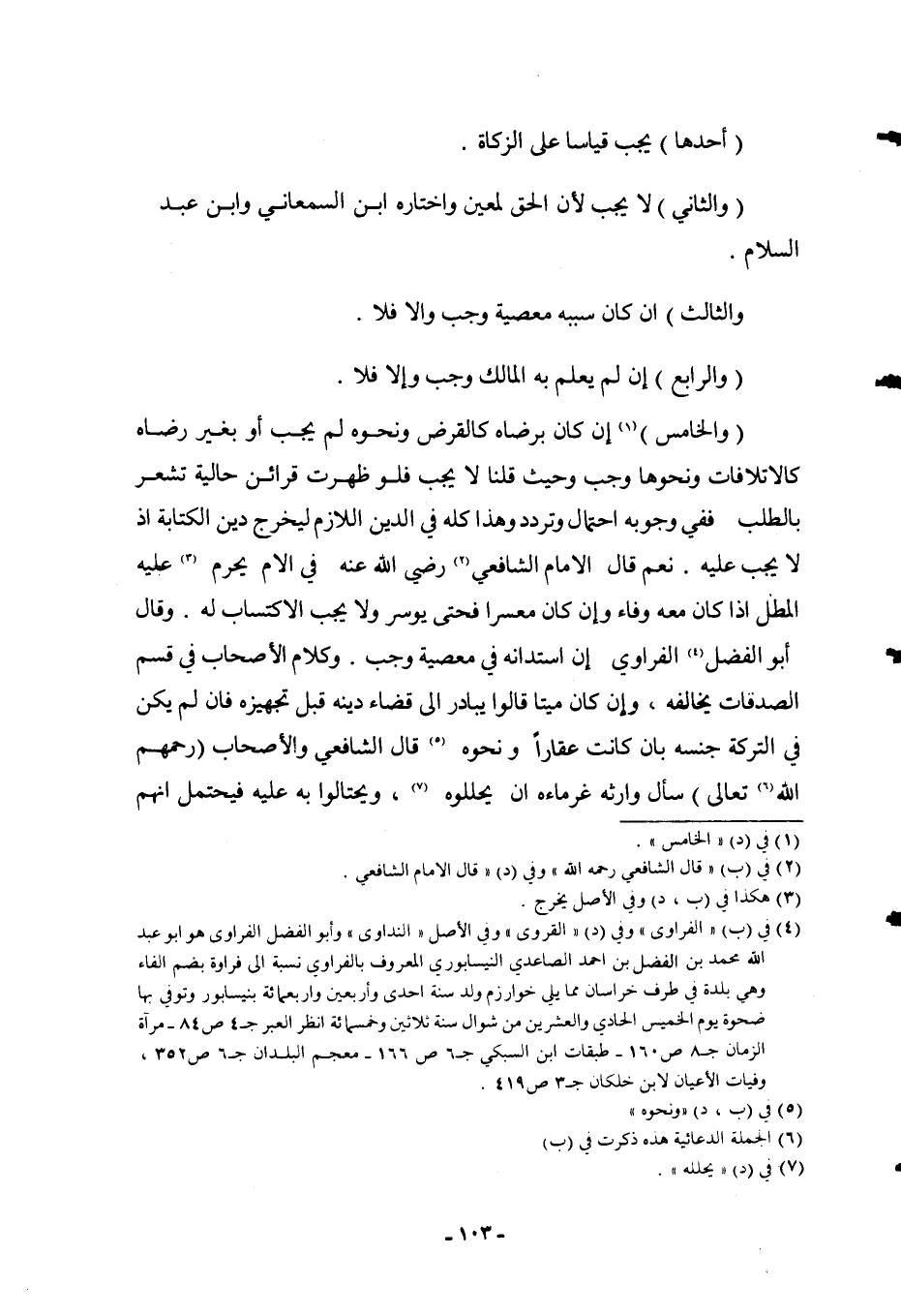 (وَالْخَامِسُ) إنْ كَانَ بِرِضَاهُ كَالْقَرْضِ وَنَحْوِهِ لَمْ يَجِبْ أَوْ بِغَيْرِ رِضَاهُ كَالْإِتْلَافَاتِ وَنَحْوِهَا وَجَبَ، وَحَيْثُ قُلْنَا لَا يَجِبُ فَلَوْ ظَهَرَتْ قَرَائِنُ حَالِيَّةٍ تُشْعِرُ بِالطَّلَبِ فَفِي وُجُوبِهِ احْتِمَالٌ وَتَرَدُّدٌ وَهَذَا كُلُّهُ فِي الدَّيْنِ اللَّازِمِ لِيَخْرُجَ دَيْنُ الْكِتَابَةِ إذْ لَا يَجِبُ عَلَيْهِ. نَعَمْ قَالَ الْإِمَامُ الشَّافِعِيُّ - رَضِيَ اللَّهُ عَنْهُ - فِي الْأُمِّ يَحْرُمُ عَلَيْهِ الْمَطْلُ إذَا كَانَ مَعَهُ وَفَاءٌ وَإِنْ كَانَ مُعْسِرًا فَحَتَّى يُوسِرَ وَلَا يَجِبُ الِاكْتِسَابُ لَهُ. وَقَالَ أَبُو الْفَضْلِ الْفَرَاوِيُّ إنْ اسْتَدَانَهُ فِي مَعْصِيَةٍ وَجَبَ. وَكَلَامُ الْأَصْحَابِ فِي قَسْمِ الصَّدَقَاتِ يُخَالِفُهُ، وَإِنْ كَانَ مَيِّتًا قَالُوا يُبَادَرُ إلَى قَضَاءِ دَيْنِهِ قَبْلَ تَجْهِيزِهِ فَإِنْ لَمْ يَكُنْ فِي التَّرِكَةِ جِنْسُهُ بِأَنْ كَانَتْ عَقَارًا وَنَحْوَهُ قَالَ الشَّافِعِيُّ وَالْأَصْحَابُ (رَحِمَهُمْ اللَّهُ تَعَالَى) سَأَلَ وَارِثُهُ غُرَمَاءَهُ أَنْ يُحَلِّلُوهُ وَيَحْتَالُوا بِهِ عَلَيْهِ فَيُحْتَمَلُ أَنَّهُمْ