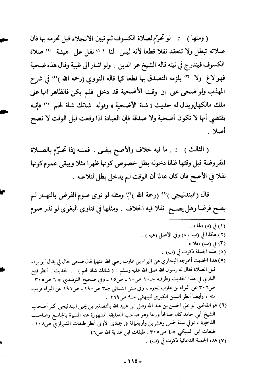(وَمِنْهَا) : لَوْ تَحَرَّمَ لِصَلَاةِ الْكُسُوفِ ثُمَّ تَبَيَّنَ الِانْجِلَاءُ قَبْلَ تَحَرُّمِهِ بِهَا فَإِنَّ صَلَاتَهُ تَبْطُلُ وَلَا تَنْعَقِدُ نَفْلًا قَطْعًا لِأَنَّهُ لَيْسَ لَنَا نَفْلٌ عَلَى هَيْئَةِ صَلَاةِ الْكُسُوفِ فَيَنْدَرِجُ فِي نِيَّتِهِ قَالَهُ الشَّيْخُ عِزُّ الدِّينِ.