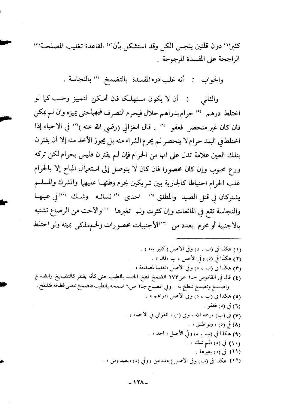 كَثِيرٍ دُونَ قُلَّتَيْنِ يَنْجَسُ الْكُلُّ وَقَدْ اسْتَشْكَلَ بِأَنَّ الْقَاعِدَةَ تَغْلِيبُ الْمَصْلَحَةِ الرَّاجِحَةِ عَلَى الْمَفْسَدَةِ الْمَرْجُوحَةِ. وَالْجَوَابُ: أَنَّهُ غَلَبَ دَرْءُ الْمَفْسَدَةِ بِالتَّضَمُّخِ بِالنَّجَاسَةِ. وَالثَّانِي: أَنْ لَا يَكُونَ مُسْتَهْلَكًا فَإِنْ أَمْكَنَ التَّمْيِيزُ وَجَبَ كَمَا لَوْ اخْتَلَطَ دِرْهَمٌ حَرَامٌ بِدَرَاهِمَ حَلَالٍ فَيَحْرُمُ التَّصَرُّفُ فِيهِمَا حَتَّى يُمَيِّزَهُ وَإِنْ لَمْ يُمْكِنْ فَإِنْ كَانَ غَيْرَ مُنْحَصِرٍ فَعَفْوٌ. قَالَ الْغَزَالِيُّ (- رَضِيَ اللَّهُ عَنْهُ -) فِي الْإِحْيَاءِ إذَا اخْتَلَطَ فِي الْبَلَدِ حَرَامٌ لَا يَنْحَصِرُ لَمْ يَحْرُمْ الشِّرَاءُ مِنْهُ بَلْ يَجُوزُ الْأَخْذُ مِنْهُ إلَّا أَنْ يَقْتَرِنَ بِتِلْكَ الْعَيْنِ عَلَامَةٌ تَدُلُّ عَلَى أَنَّهَا مِنْ الْحَرَامِ فَإِنْ لَمْ يَقْتَرِنْ فَلَيْسَ بِحَرَامٍ لَكِنَّ تَرْكَهُ وَرَعٌ مَحْبُوبٌ وَإِنْ كَانَ مَحْصُورًا، فَإِنْ كَانَ لَا يُتَوَصَّلُ إلَى اسْتِعْمَالِ الْمُبَاحِ إلَّا بِالْحَرَامِ غَلَبَ الْحَرَامُ احْتِيَاطًا كَالْجَارِيَةِ بَيْنَ شَرِيكَيْنِ يَحْرُمُ وَطْؤُهَا عَلَيْهِمَا، وَالْمُشْرِكِ وَالْمُسْلِمِ يَشْتَرِكَانِ فِي قَتْلِ الصَّيْدِ، وَالْمُطَلِّقِ إحْدَى نِسَائِهِ وَشَكَّ فِي عَيْنِهَا، وَالنَّجَاسَةِ تَقَعُ فِي الْمَائِعَاتِ وَإِنْ كَثُرَتْ وَلَمْ تُغَيِّرْهَا وَالْأُخْتِ مِنْ الرَّضَاعِ تَشْتَبِهُ بِالْأَجْنَبِيَّةِ أَوْ مَحْرَمٍ بِعَدَدٍ مِنْ الْأَجْنَبِيَّاتِ مَحْصُورَاتٍ، وَلَحْمٍ مُذَكًّى بِمَيْتَةٍ، وَلَوْ اخْتَلَطَ