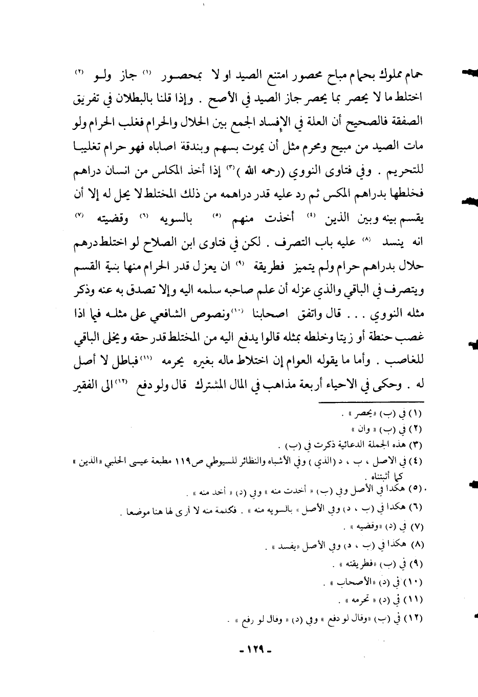 وَفِي فَتَاوَى النَّوَوِيِّ (- رَحِمَهُ اللَّهُ -) إذَا أَخَذَ الْمَكَّاسُ مِنْ إنْسَانٍ دَرَاهِمَ فَخَلَطَهَا بِدَرَاهِمِ الْمَكْسِ ثُمَّ رَدَّ عَلَيْهِ قَدْرَ دَرَاهِمِهِ مِنْ ذَلِكَ الْمُخْتَلَطِ لَا يَحِلُّ لَهُ إلَّا أَنْ يَقْسِمَ بَيْنَهُ وَبَيْنَ الَّذِينَ أُخِذَتْ مِنْهُمْ بِالسَّوِيَّةِ وَقَضِيَّتُهُ أَنَّهُ يَنْسَدُّ عَلَيْهِ بَابُ التَّصَرُّفِ. لَكِنْ فِي فَتَاوَى ابْنِ الصَّلَاحِ لَوْ اخْتَلَطَ دِرْهَمٌ حَلَالٌ بِدَرَاهِمَ حَرَامٍ وَلَمْ يَتَمَيَّزْ فَطَرِيقَتُهُ أَنْ يَعْزِلَ قَدْرَ الْحَرَامِ مِنْهَا بِنِيَّةِ الْقَسْمِ وَيَتَصَرَّفَ فِي الْبَاقِي، وَاَلَّذِي عَزَلَهُ إنْ عَلِمَ صَاحِبَهُ سَلَّمَهُ إلَيْهِ وَإِلَّا تَصَدَّقَ بِهِ عَنْهُ وَذَكَرَ مِثْلَهُ النَّوَوِيُّ قَالَ وَاتَّفَقَ أَصْحَابُنَا وَنُصُوصُ الشَّافِعِيِّ عَلَى مِثْلِهِ فِيمَا إذَا غَصَبَ حِنْطَةً أَوْ زَيْتًا وَخَلَطَهُ بِمِثْلِهِ قَالُوا يَدْفَعُ إلَيْهِ مِنْ الْمُخْتَلَطِ قَدْرَ حَقِّهِ وَيُخَلِّي الْبَاقِيَ لِلْغَاصِبِ. وَأَمَّا مَا يَقُولُهُ الْعَوَامُّ إنَّ اخْتِلَاطَ مَالِهِ بِغَيْرِهِ يُحَرِّمُهُ فَبَاطِلٌ لَا أَصْلَ لَهُ.