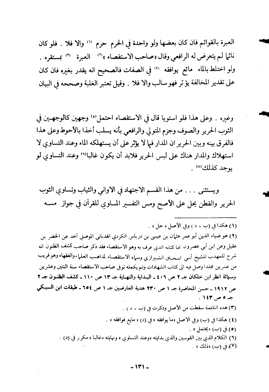 وَيُسْتَثْنَى مِنْ هَذَا الْقِسْمِ الِاجْتِهَادُ فِي الْأَوَانِي وَالثِّيَابِ، وَتَسَاوِي الثَّوْبِ الْحَرِيرِ وَالْقُطْنِ يَحِلُّ عَلَى الْأَصَحِّ، وَمَسُّ التَّفْسِيرِ الْمُسَاوِي لِلْقُرْآنِ فِي جَوَازِ مَسِّهِ