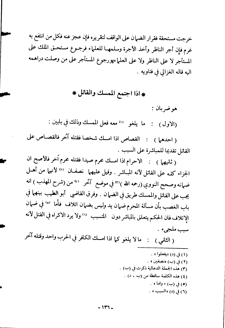 (أَحَدُهُمَا) : الْقِصَاصُ إذَا أَمْسَكَ شَخْصًا فَقَتَلَهُ آخَرُ فَالْقِصَاصُ عَلَى الْقَاتِلِ تَقْدِيمًا لِلْمُبَاشَرَةِ عَلَى السَّبَبِ.