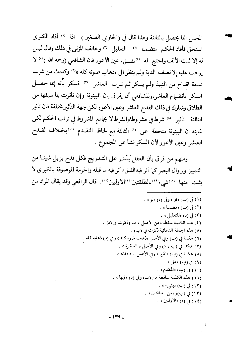 الْمُحَلِّلِ إنَّمَا يَحْصُلُ بِالثَّالِثَةِ وَلِهَذَا قَالَ فِي (الْحَاوِي الصَّغِيرِ) إذَا أَفَادَ الْكُبْرَى اسْتَحَقَّ فَأَفَادَ الْحُكْمَ مُتَضَمِّنًا التَّعْلِيلَ وَخَالَفَ الْمُزَنِيّ فِي ذَلِكَ وَقَالَ لَيْسَ لَهُ إلَّا ثُلُثُ الْأَلْفِ وَاحْتَجَّ لَهُ بِفَقْءِ عَيْنِ الْأَعْوَرِ فَإِنَّ الشَّافِعِيَّ (- رَحِمَهُ اللَّهُ -) لَا يُوجِبُ عَلَيْهِ إلَّا نِصْفَ الدِّيَةِ وَلَمْ يَنْظُرْ إلَى " ذَهَابِ ضَوْئِهِ كُلِّهِ " وَكَذَلِكَ مَنْ شَرِبَ تِسْعَةَ أَقْدَاحٍ مِنْ النَّبِيذِ وَلَمْ يَسْكَرْ ثُمَّ شَرِبَ الْعَاشِرَ فَسَكِرَ بِأَنَّهُ إنَّمَا حَصَلَ السُّكْرُ بِانْضِمَامِ الْعَاشِرِ. وَلِلشَّافِعِيِّ أَنْ يُفَرِّقَ بِأَنَّ الْبَيْنُونَةَ وَإِنْ تَأَثَّرَتْ بِمَا سَبَقَهَا مِنْ الطَّلَاقِ وَشَارَكَ فِي ذَلِكَ الْقَدَحُ الْعَاشِرُ وَعَيْنُ الْأَعْوَرِ لَكِنَّ جِهَةَ التَّأْثِيرِ مُخْتَلِفَةٌ فَإِنَّ تَأْثِيرَ الثَّالِثَةِ تَأْثِيرُ شَرْطٍ فِي مَشْرُوطٍ، وَالشَّرْطُ لَا يُجَامِعُ الْمَشْرُوطَ فِي تَرَتُّبِ الْحُكْمِ لَكِنَّ غَايَتَهُ أَنَّ الْبَيْنُونَةَ مُنْحَطَّةٌ عَنْ الثَّالِثَةِ مَعَ لِحَاظِ التَّقَدُّمِ بِخِلَافِ الْقَدَحِ الْعَاشِرِ وَعَيْنِ الْأَعْوَرِ لِأَنَّ السُّكْرَ نَشَأَ عَنْ الْمَجْمُوعِ.