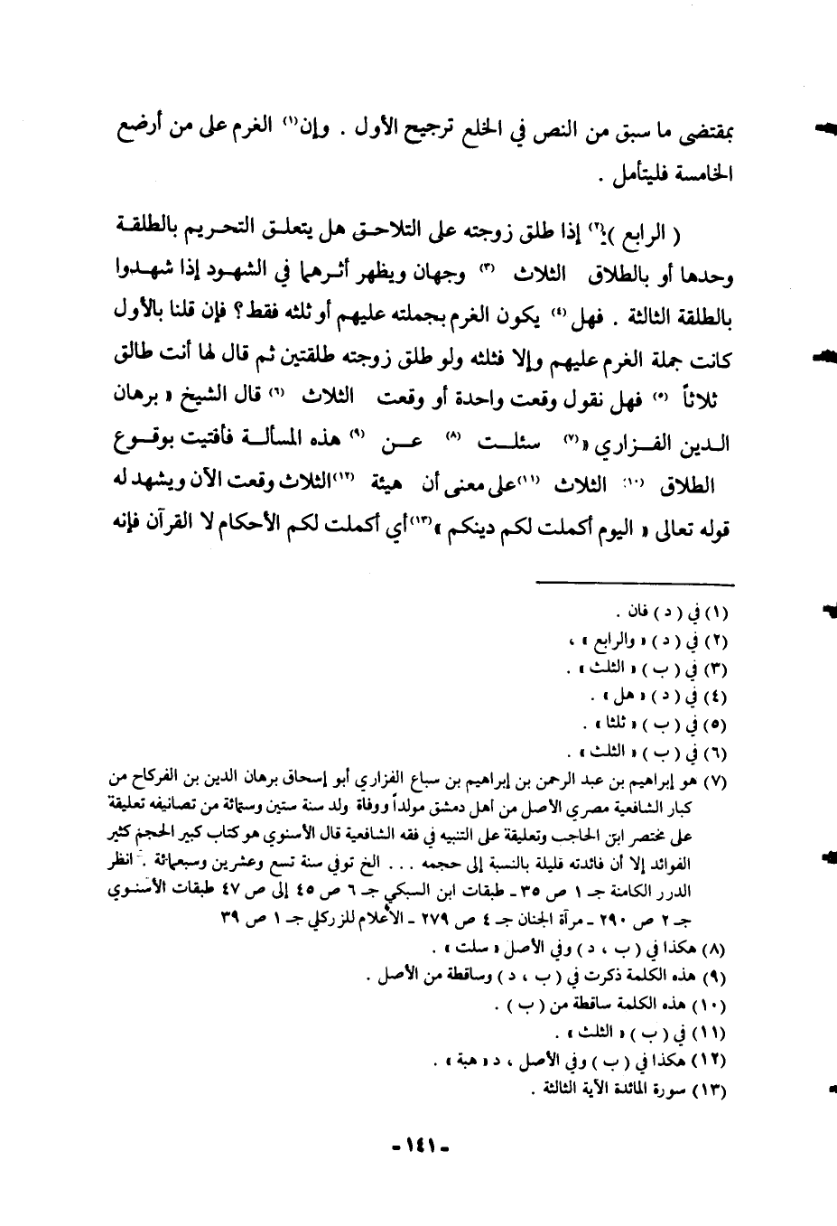 (الرَّابِعُ) : إذَا طَلَّقَ زَوْجَتَهُ عَلَى التَّلَاحُقِ هَلْ يَتَعَلَّقُ التَّحْرِيمُ بِالطَّلْقَةِ وَحْدَهَا أَوْ بِالطَّلَاقِ الثَّلَاثِ؟ وَجْهَانِ وَيَظْهَرُ أَثَرُهُمَا فِي الشُّهُودِ إذَا شَهِدُوا بِالطَّلْقَةِ الثَّالِثَةِ. فَهَلْ يَكُونُ الْغُرْمُ بِجُمْلَتِهِ عَلَيْهِمْ أَوْ ثُلُثِهِ فَقَطْ؟ فَإِنْ قُلْنَا بِالْأَوَّلِ كَانَتْ جُمْلَةُ الْغُرْمِ عَلَيْهِمْ وَإِلَّا فَثُلُثُهُ وَلَوْ طَلَّقَ زَوْجَتَهُ طَلْقَتَيْنِ ثُمَّ قَالَ لَهَا أَنْتِ طَالِقٌ ثَلَاثًا فَهَلْ نَقُولُ وَقَعَتْ وَاحِدَةٌ أَوْ وَقَعَتْ الثَّلَاثُ؟ قَالَ الشَّيْخُ " بُرْهَانُ الدِّينِ الْفَزَارِيّ " سُئِلْت. عَنْ هَذِهِ الْمَسْأَلَةِ فَأَفْتَيْت بِوُقُوعِ الطَّلَاقِ الثَّلَاثِ عَلَى مَعْنَى أَنَّ هَيْئَةَ الثَّلَاثِ وَقَعَتْ الْآنَ وَيَشْهَدُ لَهُ قَوْله تَعَالَى {الْيَوْمَ أَكْمَلْتُ لَكُمْ دِينَكُمْ} [المائدة: ٣] أَيْ أَكْمَلْت لَكُمْ الْأَحْكَامَ لَا الْقُرْآنَ فَإِنَّهُ