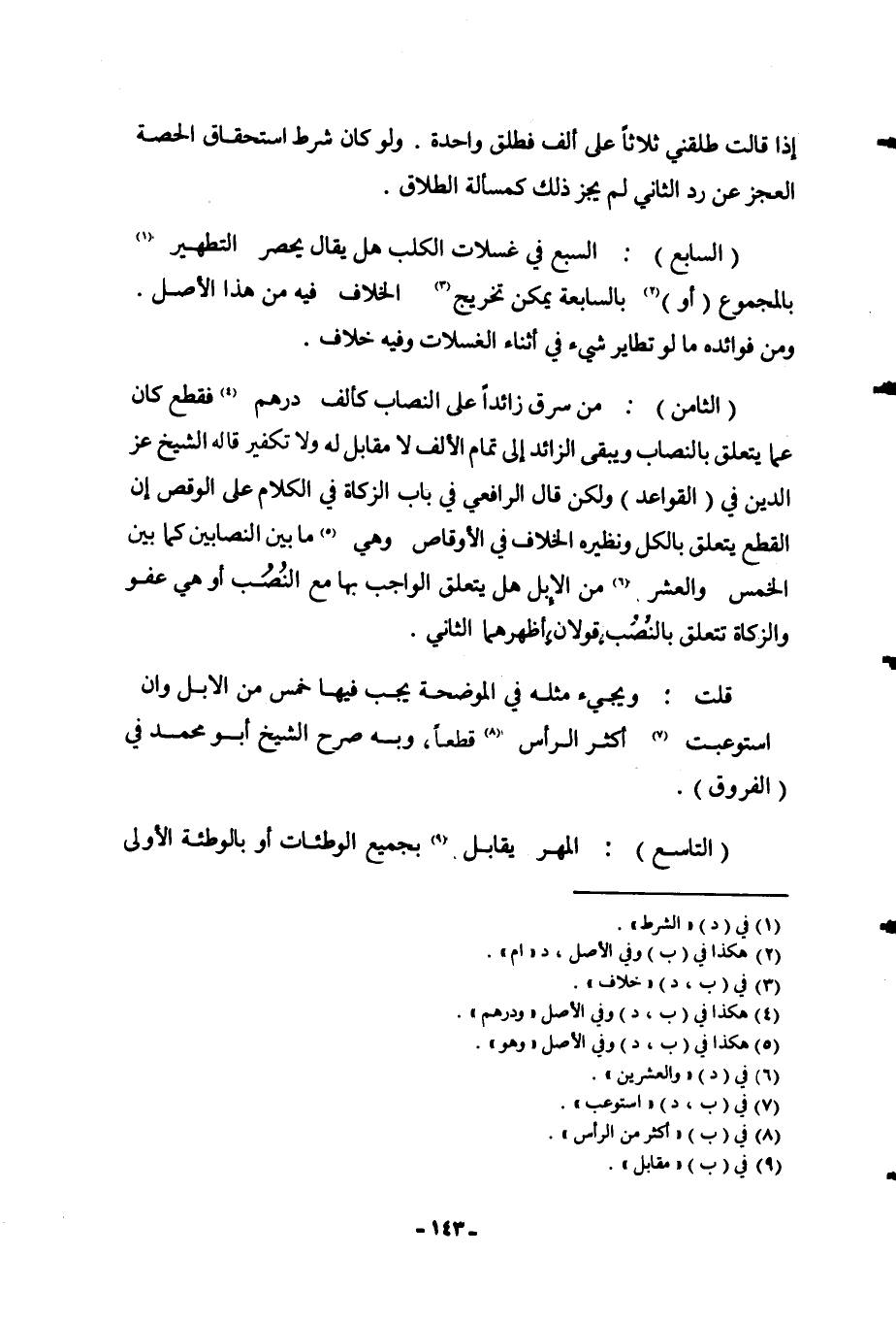 (الثَّامِنُ) : مَنْ سَرَقَ زَائِدًا عَلَى النِّصَابِ كَأَلْفِ دِرْهَمٍ فَقُطِعَ كَانَ عَمَّا يَتَعَلَّقُ بِالنِّصَابِ وَيَبْقَى الزَّائِدُ إلَى تَمَامِ الْأَلْفِ لَا مُقَابِلَ لَهُ وَلَا تَكْفِيرَ قَالَهُ الشَّيْخُ عِزُّ الدِّينِ فِي (الْقَوَاعِدِ) وَلَكِنْ قَالَ الرَّافِعِيُّ فِي بَابِ الزَّكَاةِ فِي الْكَلَامِ عَلَى الْوَقْصِ إنَّ الْقَطْعَ يَتَعَلَّقُ بِالْكُلِّ وَنَظِيرُهُ الْخِلَافُ فِي الْأَوْقَاصِ وَهِيَ مَا بَيْنَ النِّصَابَيْنِ كَمَا بَيْنَ الْخَمْسِ وَالْعَشْرِ مِنْ الْإِبِلِ هَلْ يَتَعَلَّقُ الْوَاجِبُ بِهَا مَعَ النُّصُبِ أَوْ هِيَ عَفْوٌ وَالزَّكَاةُ تَتَعَلَّقُ بِالنُّصُبِ؟ قَوْلَانِ، أَظْهَرُهُمَا الثَّانِي. قُلْت: وَيَجِيءُ مِثْلُهُ فِي الْمُوَضَّحَةِ يَجِبُ فِيهَا خَمْسٌ مِنْ الْإِبِلِ وَإِنْ اسْتَوْعَبَتْ أَكْثَرَ الرَّأْسِ قَطْعًا، وَبِهِ صَرَّحَ الشَّيْخُ أَبُو مُحَمَّدٍ فِي (الْفُرُوقِ) .