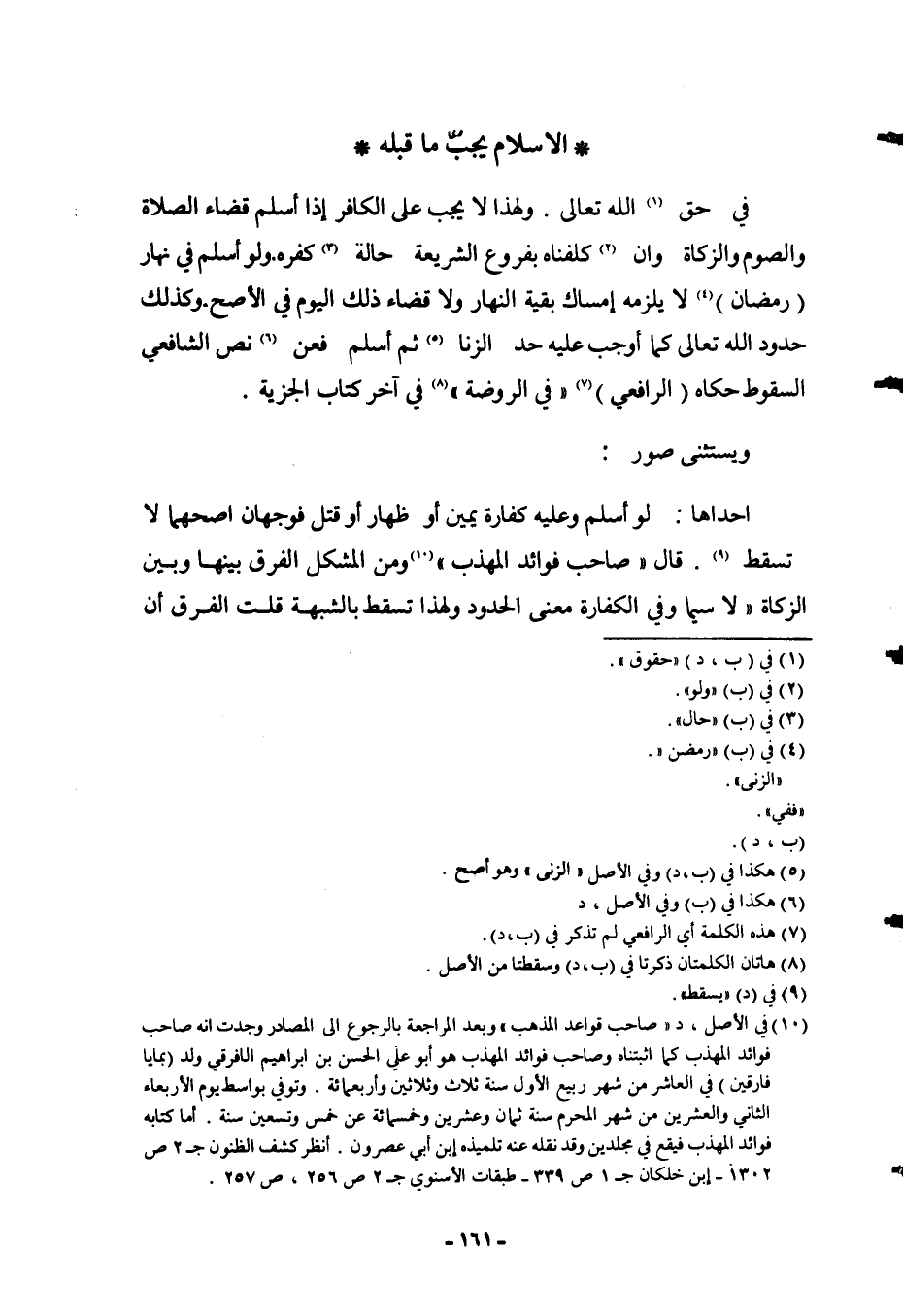 وَلِهَذَا لَا يَجِبُ عَلَى الْكَافِرِ إذَا أَسْلَمَ قَضَاءُ الصَّلَاةِ وَالصَّوْمِ وَالزَّكَاةِ وَإِنْ كَلَّفْنَاهُ بِفُرُوعِ الشَّرِيعَةِ حَالَةَ كُفْرِهِ. وَلَوْ أَسْلَمَ فِي نَهَارِ (رَمَضَانَ) لَا يَلْزَمُهُ إمْسَاكُ بَقِيَّةِ النَّهَارِ وَلَا قَضَاءُ ذَلِكَ الْيَوْمِ فِي الْأَصَحِّ.