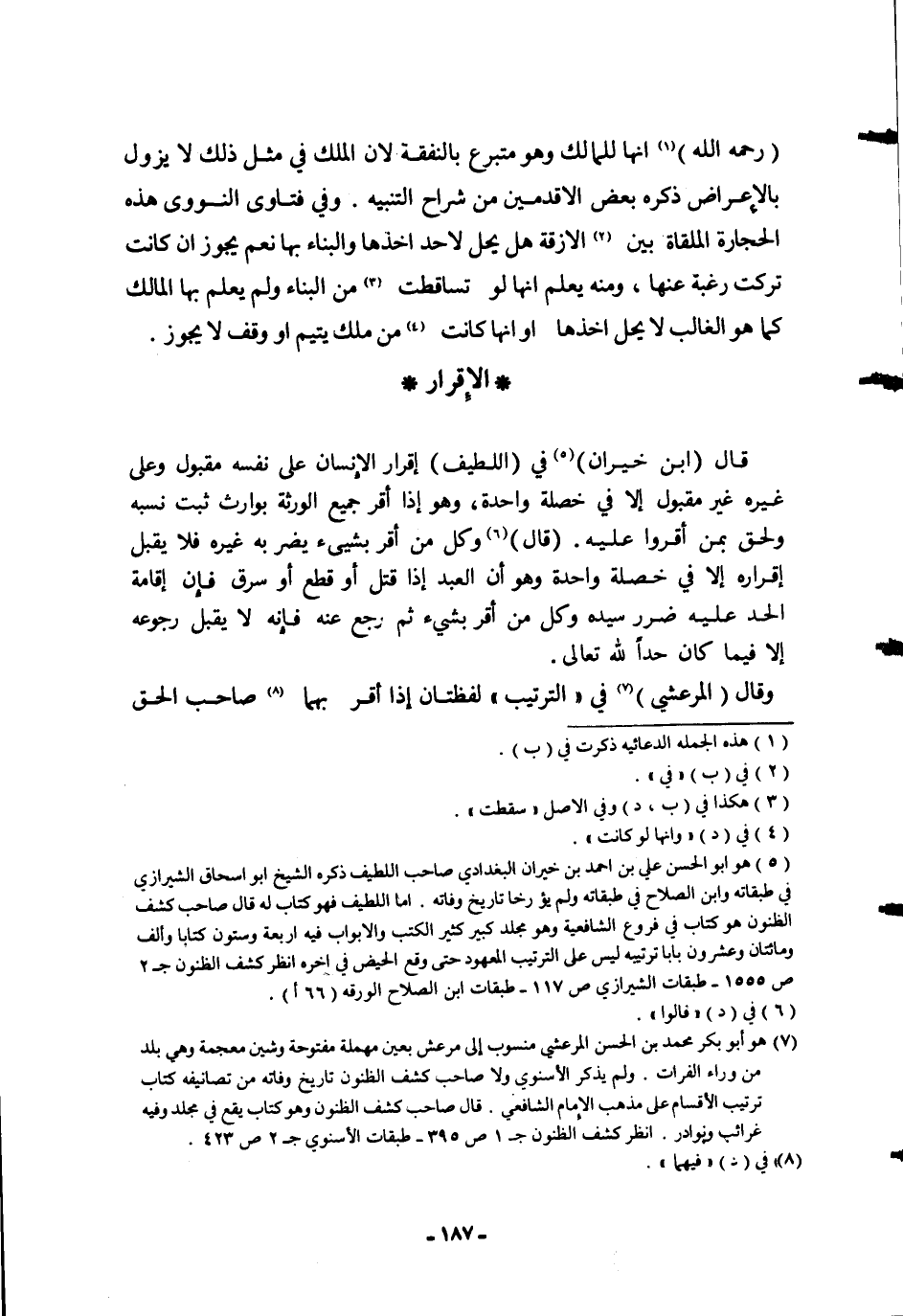وَقَالَ (الْمَرْعَشِيُّ) فِي " التَّرْتِيبِ " لَفْظَتَانِ إذَا أَقَرَّ بِهِمَا صَاحِبُ الْحَقِّ