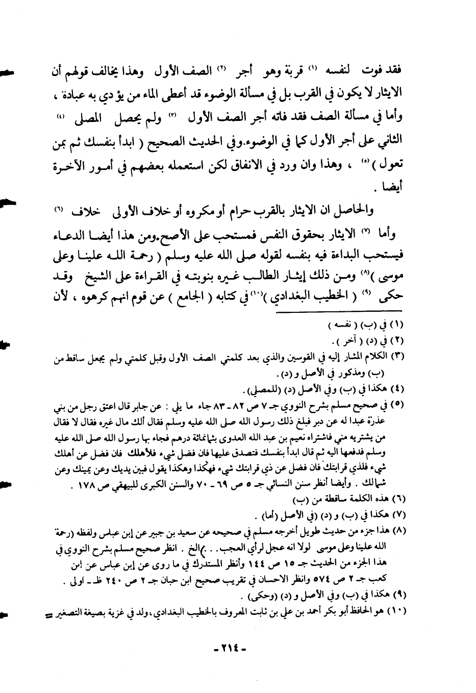 فَقَدْ فَوَّتَ لِنَفْسِهِ قُرْبَةً، وَهُوَ أَجْرُ الصَّفِّ الْأَوَّلِ، وَهَذَا يُخَالِفُ قَوْلَهُمْ: إنَّ الْإِيثَارَ لَا يَكُونُ فِي الْقُرَبِ بَلْ فِي مَسْأَلَةِ الْوُضُوءِ قَدْ أَعْطَى الْمَاءَ مَنْ يُؤَدِّي بِهِ عِبَادَةً، وَأَمَّا فِي مَسْأَلَةِ الصَّفِّ فَقَدْ فَاتَهُ أَجْرُ الصَّفِّ الْأَوَّلِ وَلَمْ يَحْصُلْ الْمُصَلِّي الثَّانِي عَلَى أَجْرِ الْأَوَّلِ كَمَا فِي الْوُضُوءِ. وَفِي الْحَدِيثِ الصَّحِيحِ «ابْدَأْ بِنَفْسِك ثُمَّ بِمَنْ تَعُولُ» ، وَهَذَا، وَإِنْ وَرَدَ فِي الْإِنْفَاقِ لَكِنْ اسْتَعْمَلَهُ بَعْضُهُمْ فِي أُمُورِ الْآخِرَةِ أَيْضًا وَالْحَاصِلُ أَنَّ الْإِيثَارَ بِالْقُرَبِ حَرَامٌ، أَوْ مَكْرُوهٌ، أَوْ خِلَافُ الْأَوْلَى خِلَافٌ، وَأَمَّا الْإِيثَارُ بِحُقُوقِ النَّفْسِ فَمُسْتَحَبٌّ عَلَى الْأَصَحِّ، وَمِنْ هَذَا أَيْضًا الدُّعَاءُ فَيُسْتَحَبُّ الْبُدَاءَةُ فِيهِ بِنَفْسِهِ؛ لِقَوْلِهِ: - صَلَّى اللَّهُ عَلَيْهِ وَسَلَّمَ - «رَحْمَةُ اللَّهِ عَلَيْنَا وَعَلَى مُوسَى» ، وَمِنْ ذَلِكَ إيثَارُ الطَّالِبِ غَيْرَهُ بِنَوْبَتِهِ فِي الْقِرَاءَةِ عَلَى الشَّيْخِ، وَقَدْ حَكَى (الْخَطِيبُ الْبَغْدَادِيُّ) فِي كِتَابِهِ (الْجَامِعِ) عَنْ قَوْمٍ أَنَّهُمْ كَرِهُوهُ؛ لِأَنَّ