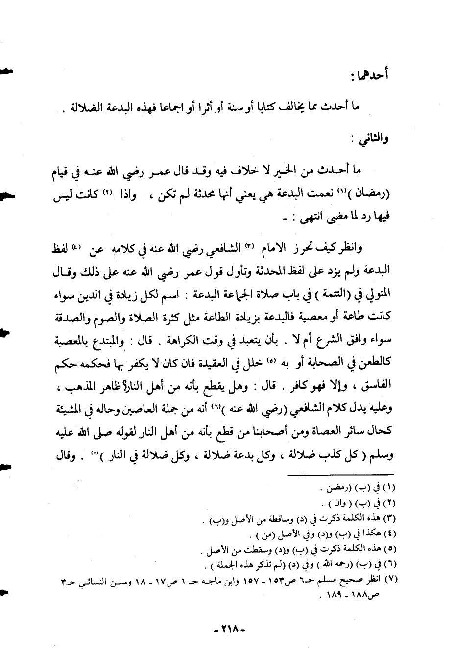 أَحَدُهُمَا: مَا أُحْدِثَ مِمَّا يُخَالِفُ كِتَابًا أَوْ سُنَّةً أَوْ أَثَرًا أَوْ إجْمَاعًا، فَهَذِهِ الْبِدْعَةُ الضَّلَالَةُ. وَالثَّانِي: مَا أُحْدِثَ مِنْ الْخَيْرِ لَا خِلَافَ فِيهِ، وَقَدْ قَالَ عُمَرُ - رَضِيَ اللَّهُ عَنْهُ - فِي قِيَامِ (رَمَضَانَ) : نِعْمَتْ الْبِدْعَةُ هِيَ يَعْنِي أَنَّهَا مُحْدَثَةٌ لَمْ تَكُنْ، وَإِذَا كَانَتْ لَيْسَ فِيهَا رَدٌّ لِمَا مَضَى انْتَهَى.