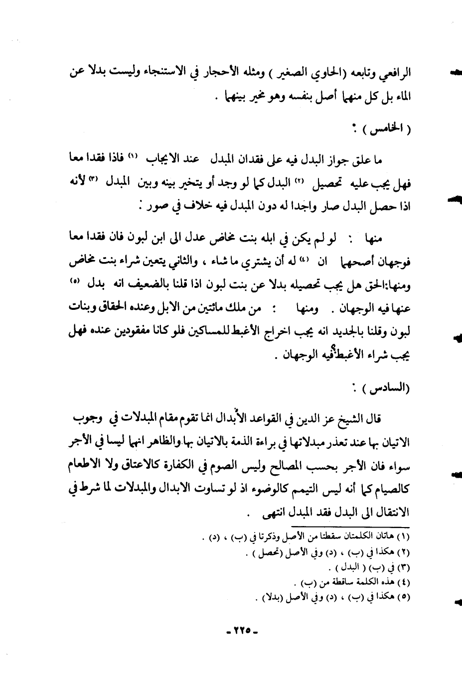 (الْخَامِسُ) : مَا عُلِّقَ جَوَازُ الْبَدَلِ فِيهِ عَلَى فِقْدَانِ الْمُبْدَلِ عِنْدَ الْإِيجَابِ، فَإِذَا فُقِدَا مَعًا، فَهَلْ يَجِبُ عَلَيْهِ تَحْصِيلُ الْبَدَلِ كَمَا لَوْ وَجَدَ، أَوْ يَتَخَيَّرُ بَيْنَهُ وَبَيْنَ الْمُبْدَلِ؛ لِأَنَّهُ إذَا حَصَلَ الْبَدَلُ صَارَ وَاجِدًا لَهُ دُونَ الْمُبْدَلِ، فِيهِ خِلَافٌ فِي صُوَرٍ: مِنْهَا: لَوْ لَمْ يَكُنْ فِي إبِلِهِ بِنْتُ مَخَاضٍ عَدَلَ إلَى ابْنِ لَبُونٍ، فَإِنْ فُقِدَا مَعًا فَوَجْهَانِ: أَصَحُّهُمَا أَنَّ لَهُ أَنْ يَشْتَرِيَ مَا شَاءَ، وَالْحَانِي يَتَعَيَّنُ شِرَاءُ بِنْتِ مَخَاضٍ وَمِنْهَا: الْحَقُّ هَلْ يَجِبُ تَحْصِيلُهُ بَدَلًا عَنْ بِنْتِ لَبُونٍ، إذَا قُلْنَا بِالضَّعِيفِ أَنَّهُ بَدَلٌ عَنْهَا فِيهِ الْوَجْهَانِ.